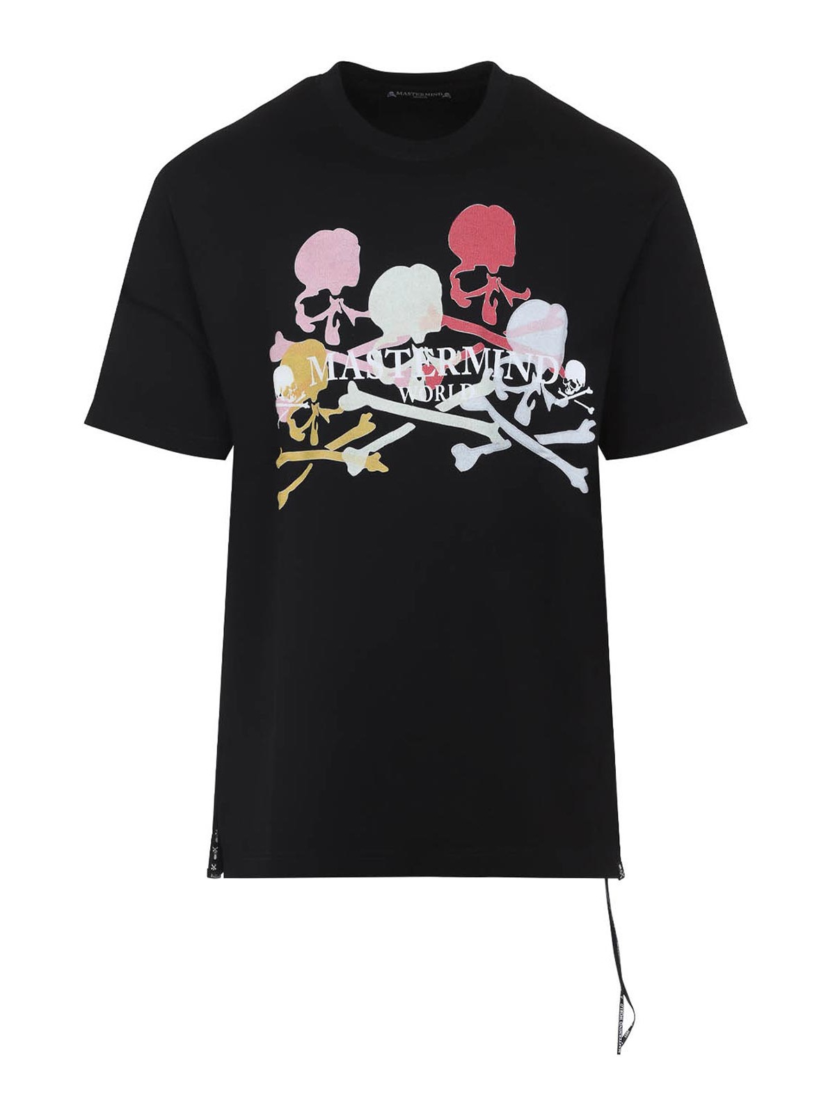 Camiseta negra de manga corta Mastermind world con múltiples calaveras, camiseta negra pura, cuello redondo, letras, logotipo, pecho, calavera multicolor, mangas cortas, costuras tonales laterales, correa tonal, dobladillo recto