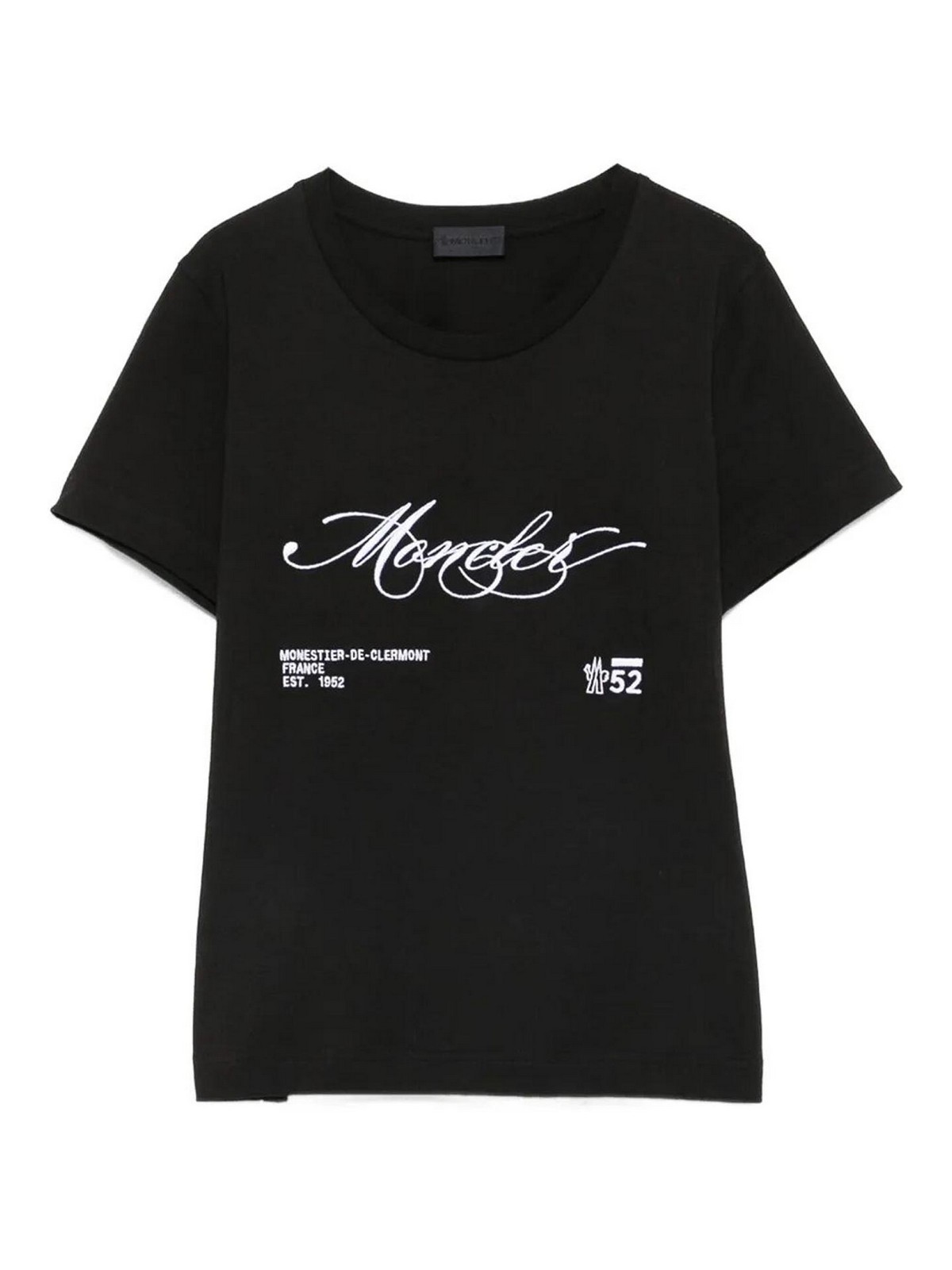 Material negro con estampado bordado, mangas cortas, cuello redondo y dobladillo recto