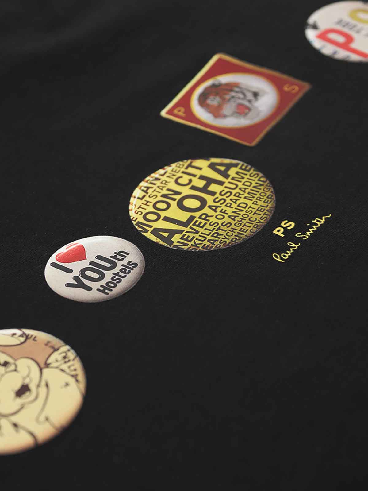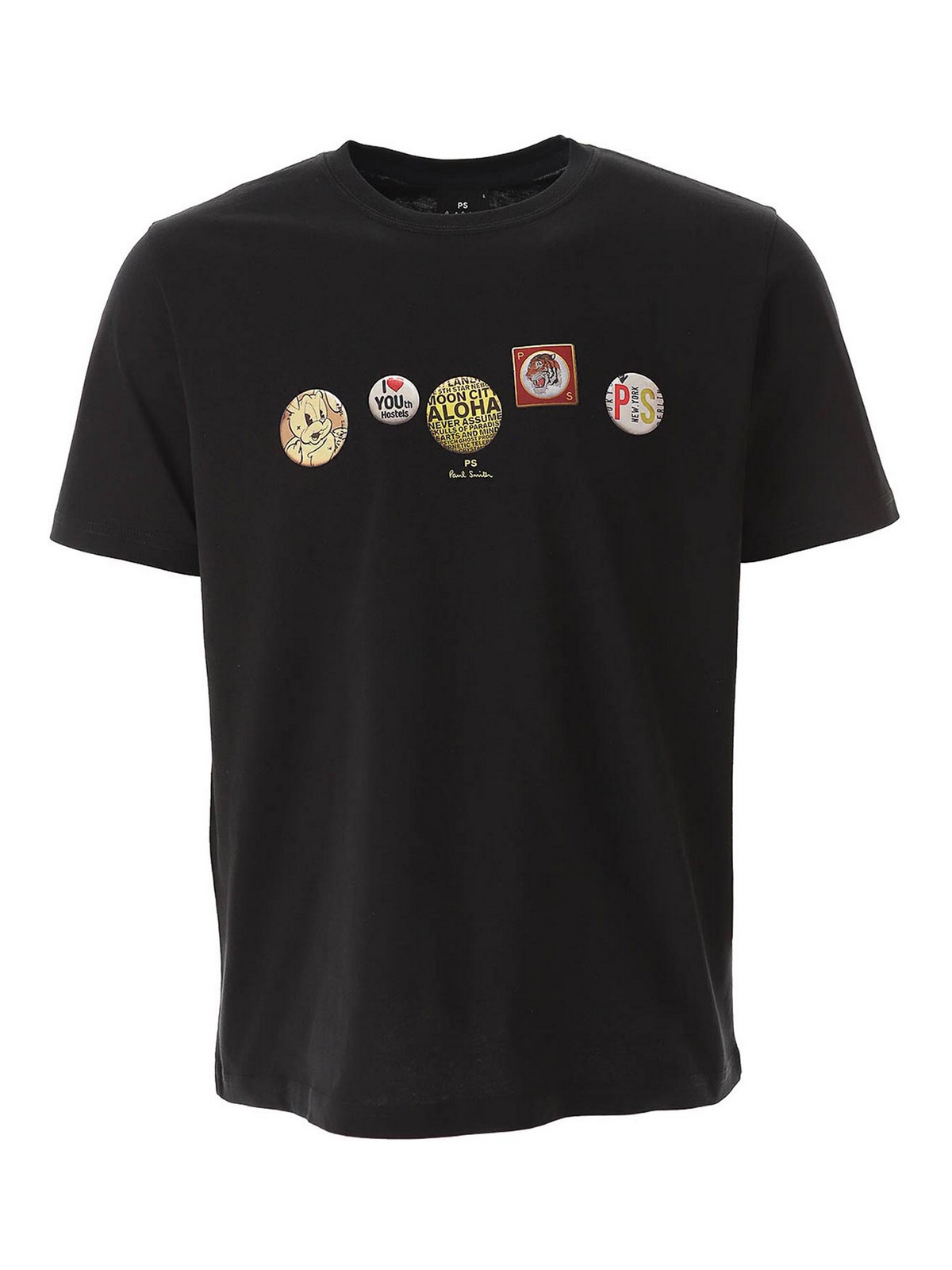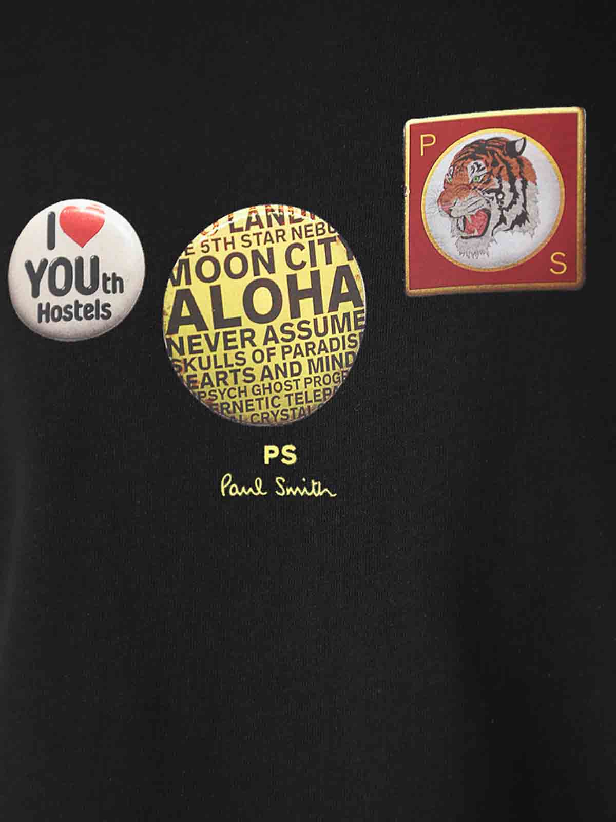 Camiseta stampa badges in nero T-shirt girocollo a maniche corte caratterizzata dalla stampa badge multicolore allineati sul altezza petto girocollo maniche corte stampa frontale badge multicolore logo ps signature in frontale organico