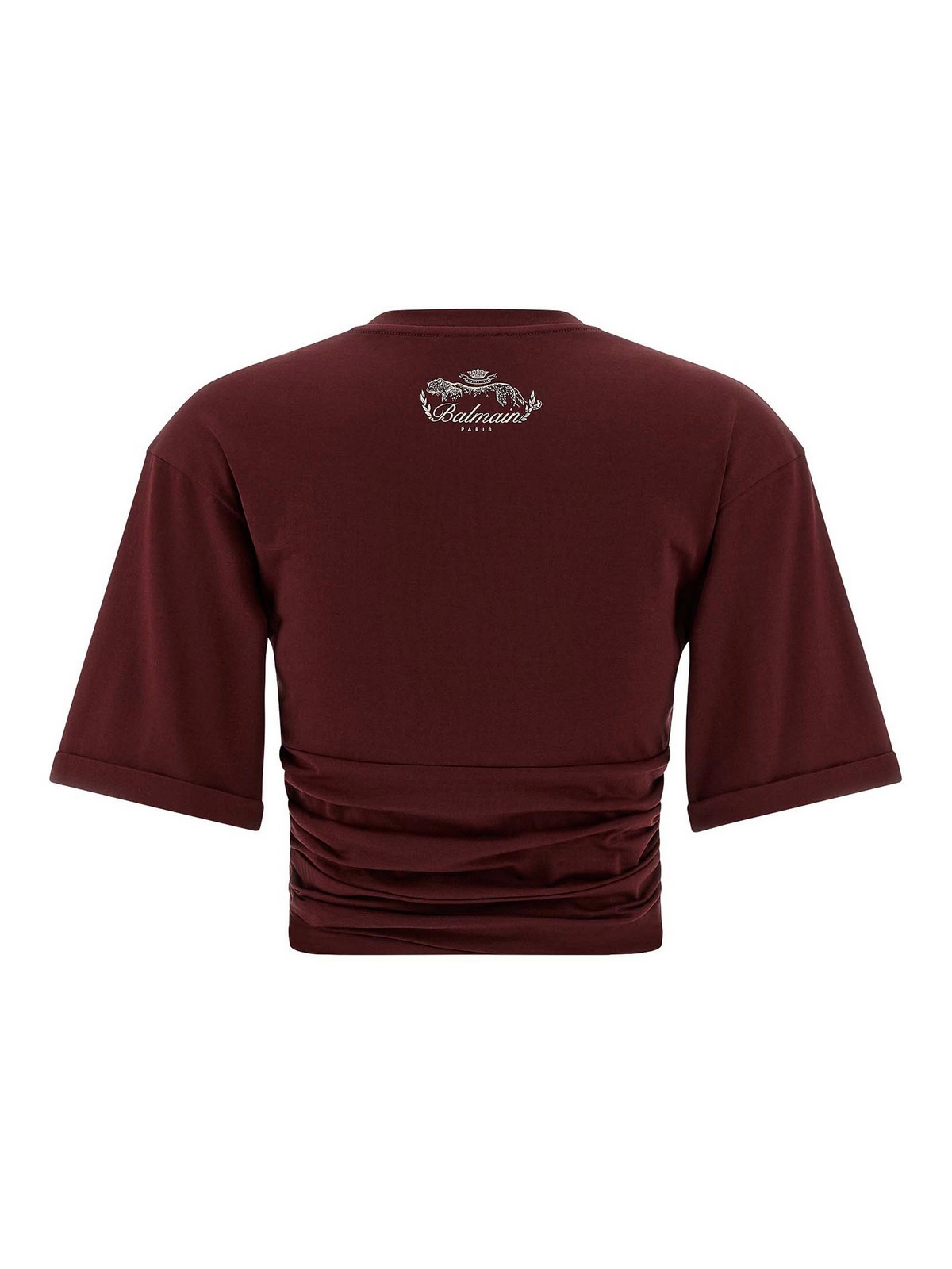 Camiseta corta de algodón con dobladillo asimétrico anudado en la parte delantera, cuello redondo, rizos laterales, mangas cortas con dobladillo en la parte inferior de la manga y hombros caídos, detalle de botón «Testa di Leone» metálico en el hombro izquierdo y estampado del logotipo en la espalda.