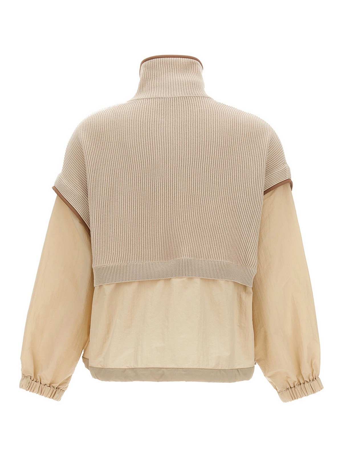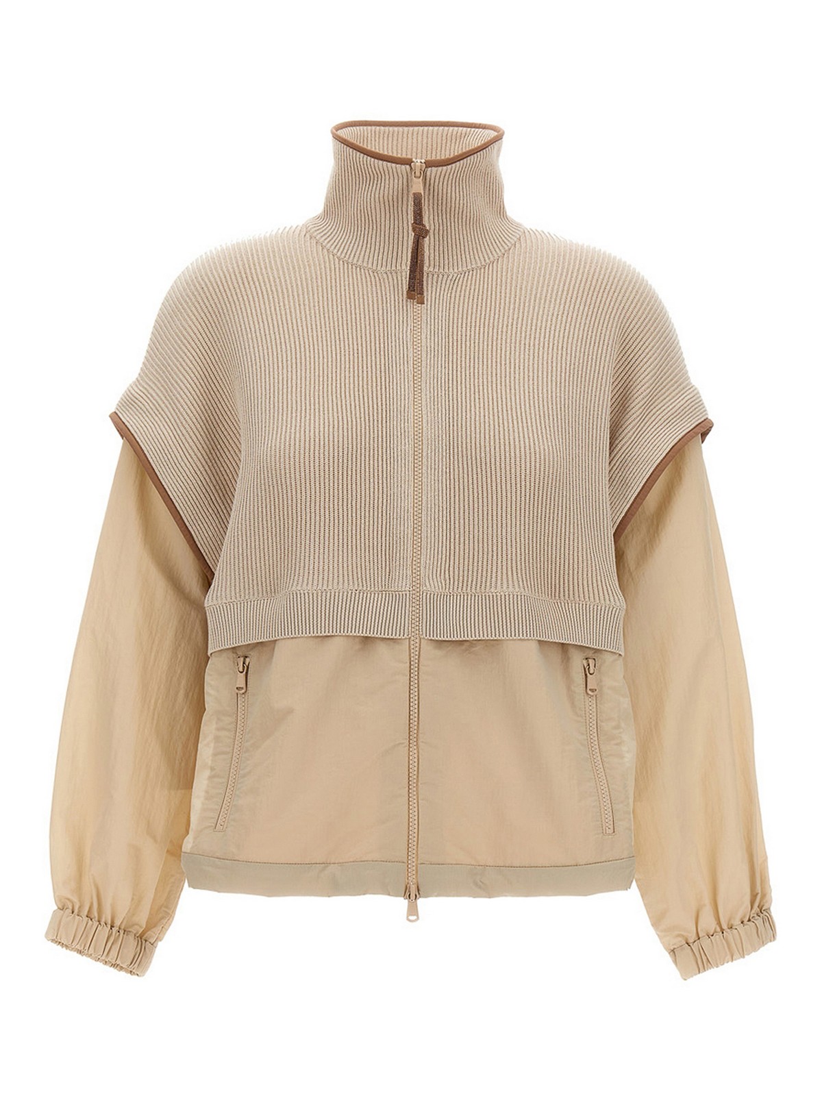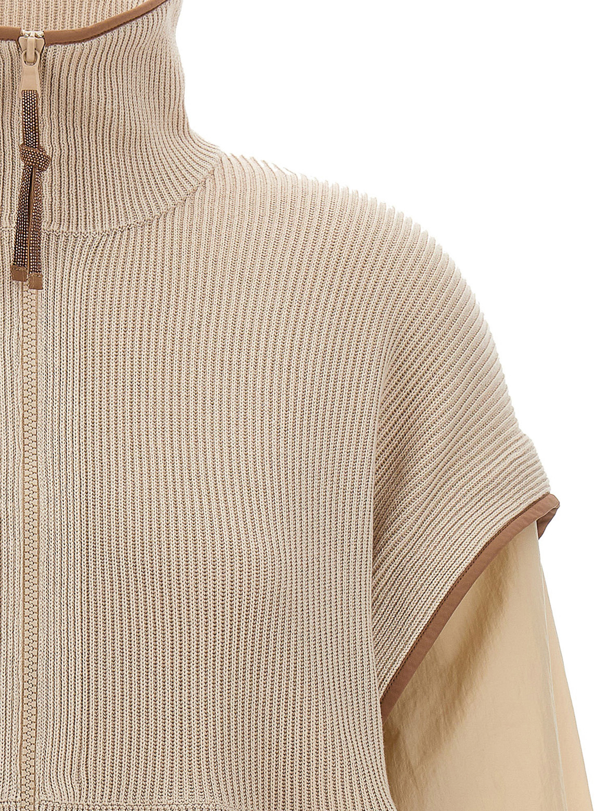 Cárdigan de punto de algodón acanalado con inserciones de nylon, cuello alto, cierre de cremallera, bolsillos, mangas largas y elásticas