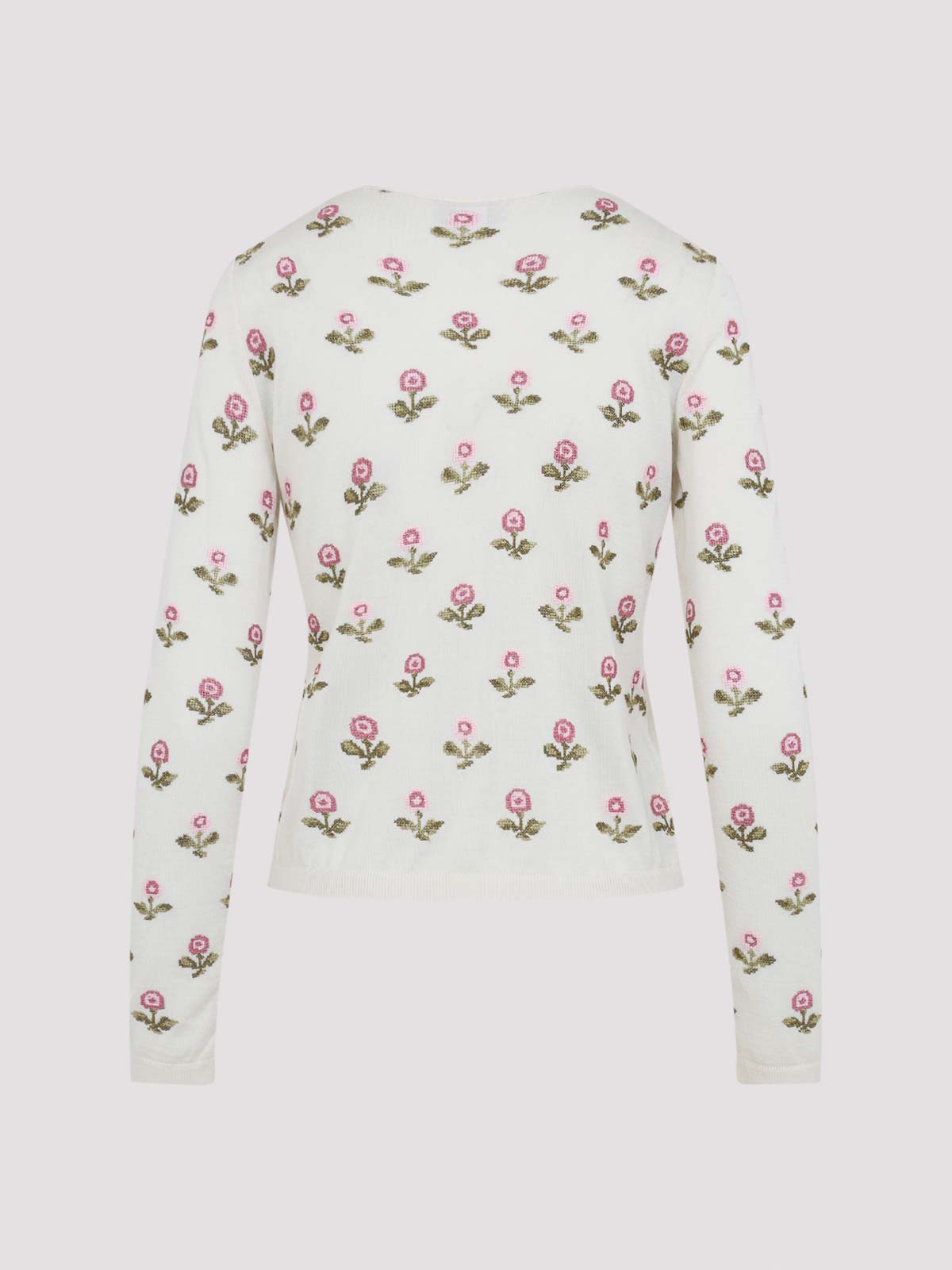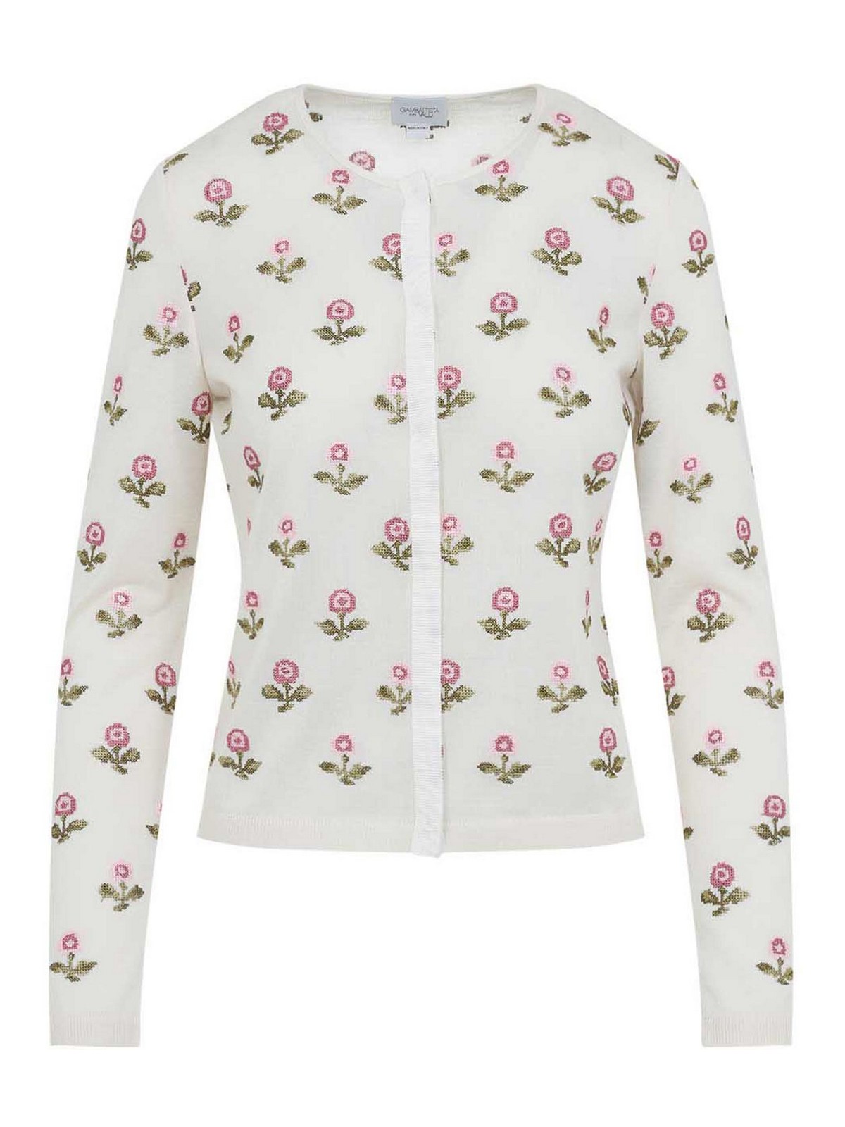 Cárdigan de punto de cachemir blanco marfil de Giambattista Valli. Confeccionado en una mezcla de cachemir y seda. Cuello redondo, cierre con botones que ocultan la parte delantera, manga larga, dobladillo recto, diseño de punto, estampado de rosas bordadas en toda la prenda.