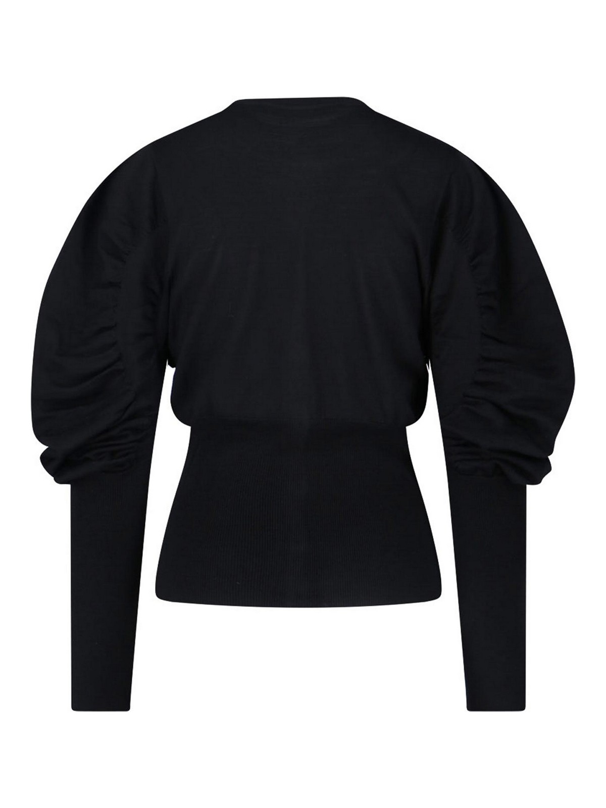 Cárdigan Eli de lana virgen negra, mangas anchas, cuello redondo, cierre con botones, logotipo orbe bordado en la parte delantera, detalle acanalado, puños maxi acanalados, dobladillo recto.