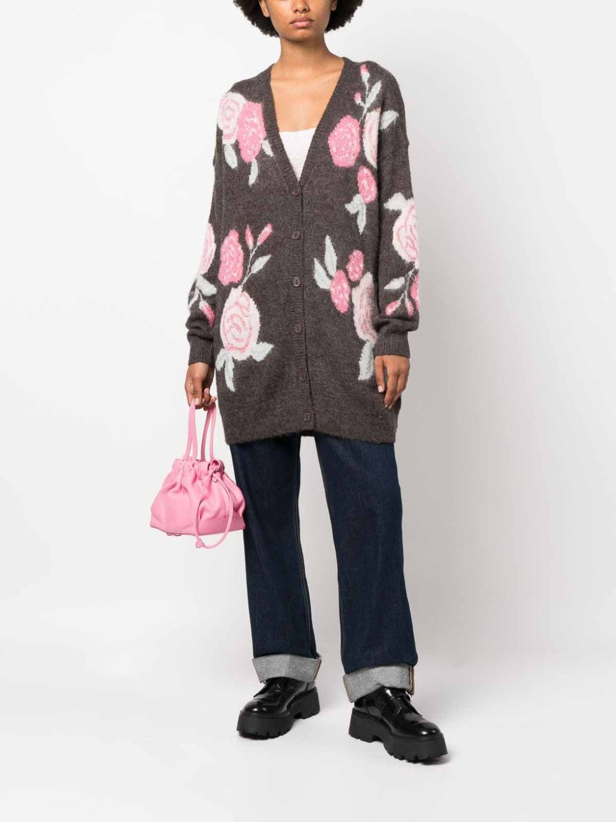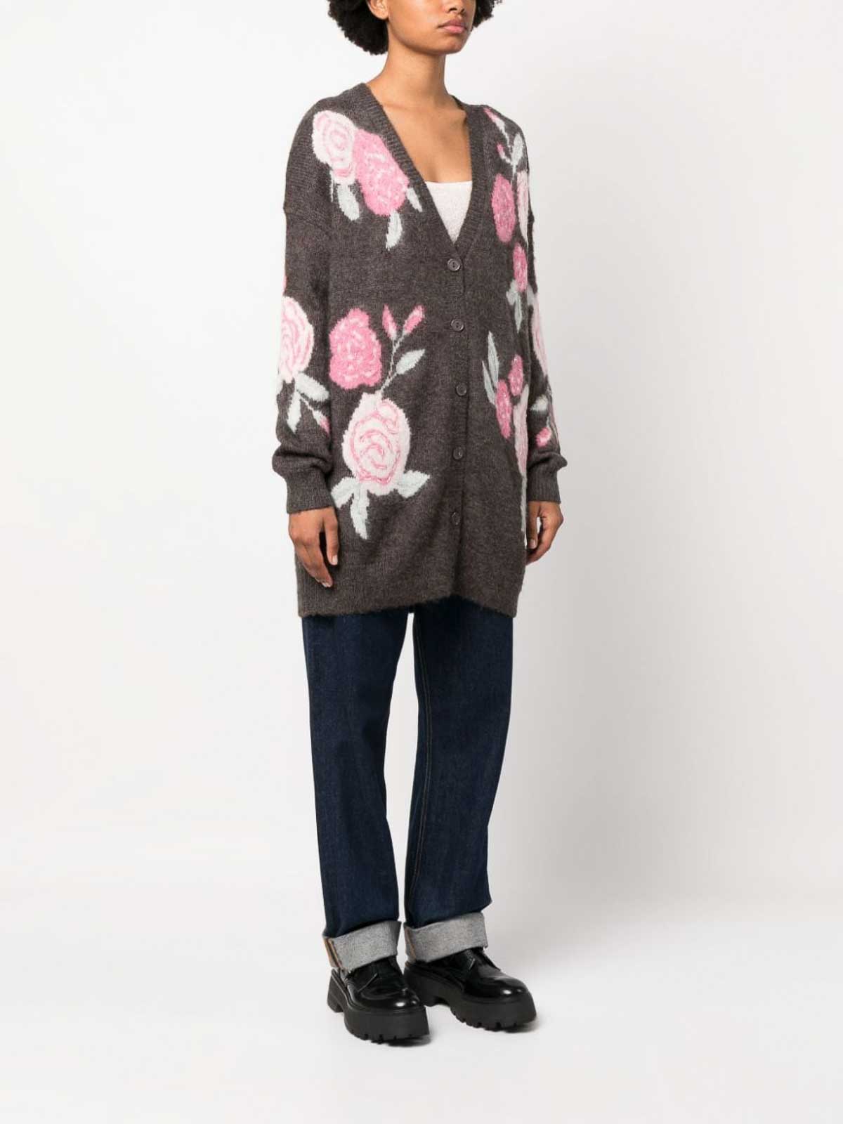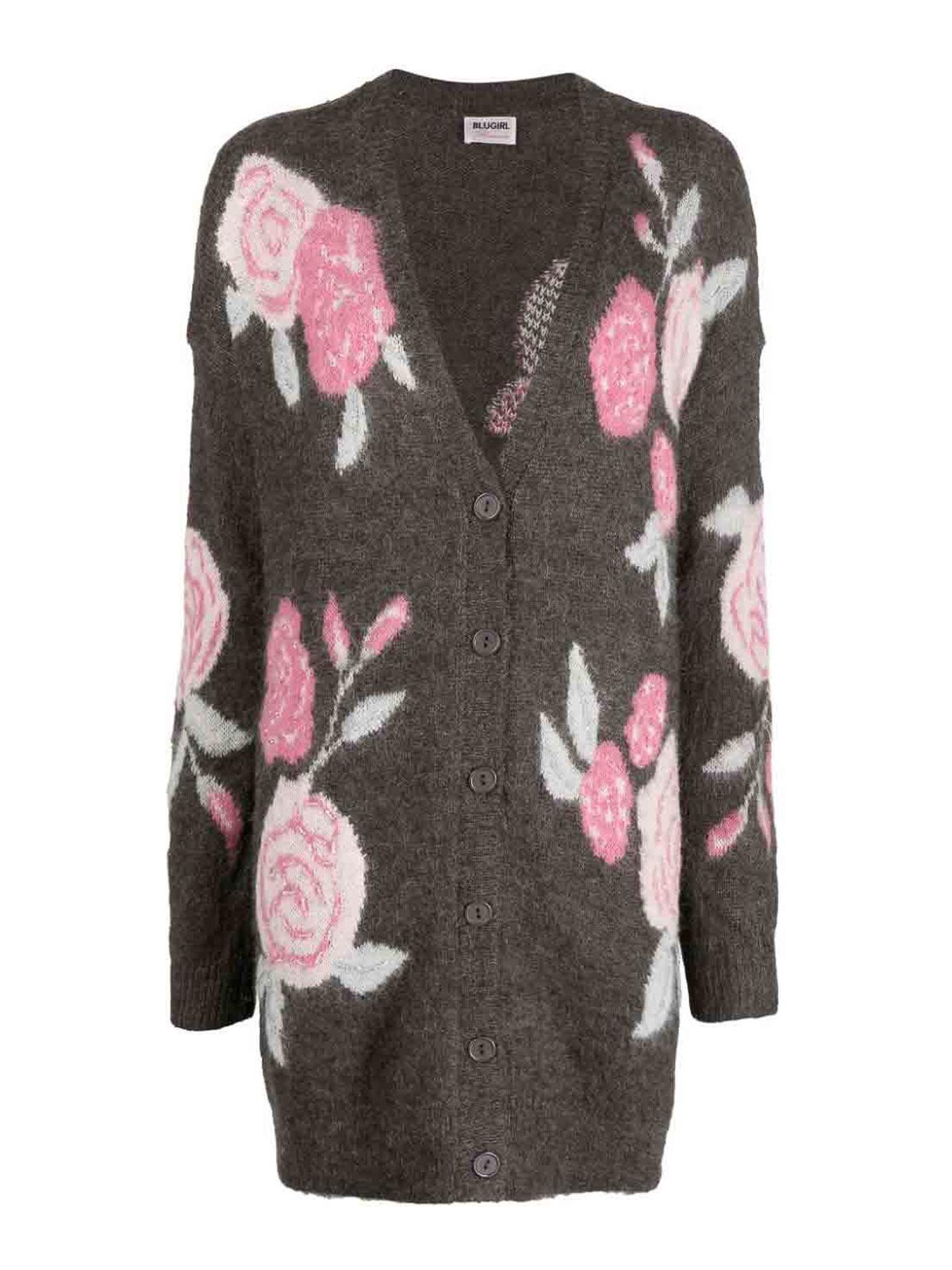 Cárdigan acanalado con estampado floral de blugirl con confección de punto en gris pimienta y rosa rosa, placa con el logotipo en tono plateado, estampado floral, cuello en V acanalado, botones, mangas largas, puños acanalados y dobladillo recto.