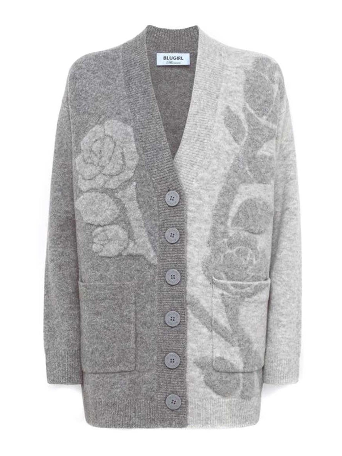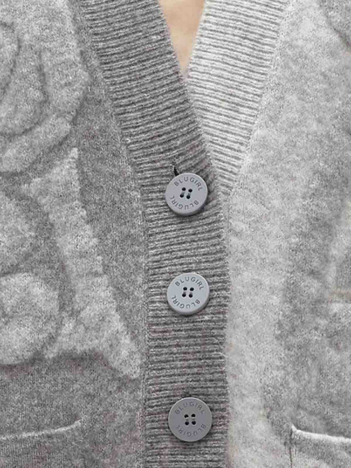 Cárdigan Blugirl con intarsia de rosas, corte extragrande, intarsia de jacquard estampada con motivo de rosas tridimensionales, escote en V, mangas largas con hombros caídos, bolsillos de parche y cierre con botones tono sobre tono.