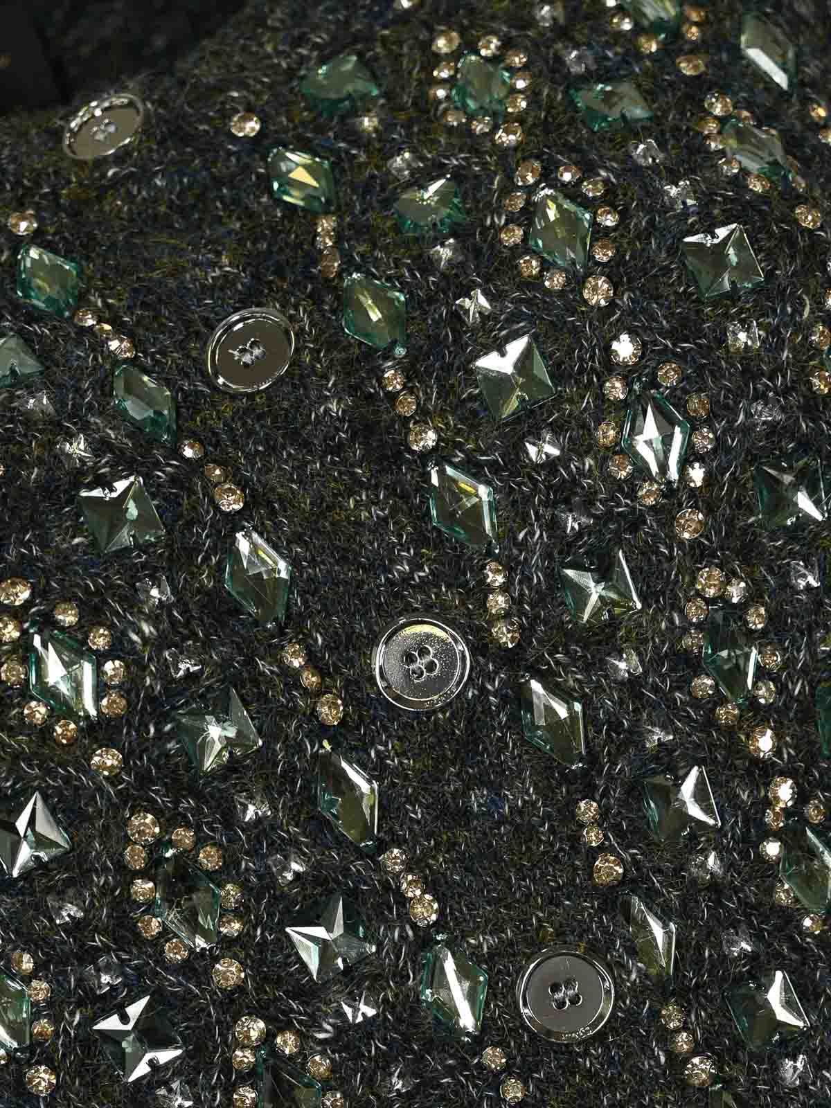 Hilo multicolor de punto acanalado en la parte posterior, punto de cable en las mangas largas, cuello redondo, botón en toda la prenda, etiqueta con el logotipo de la joya en la parte posterior