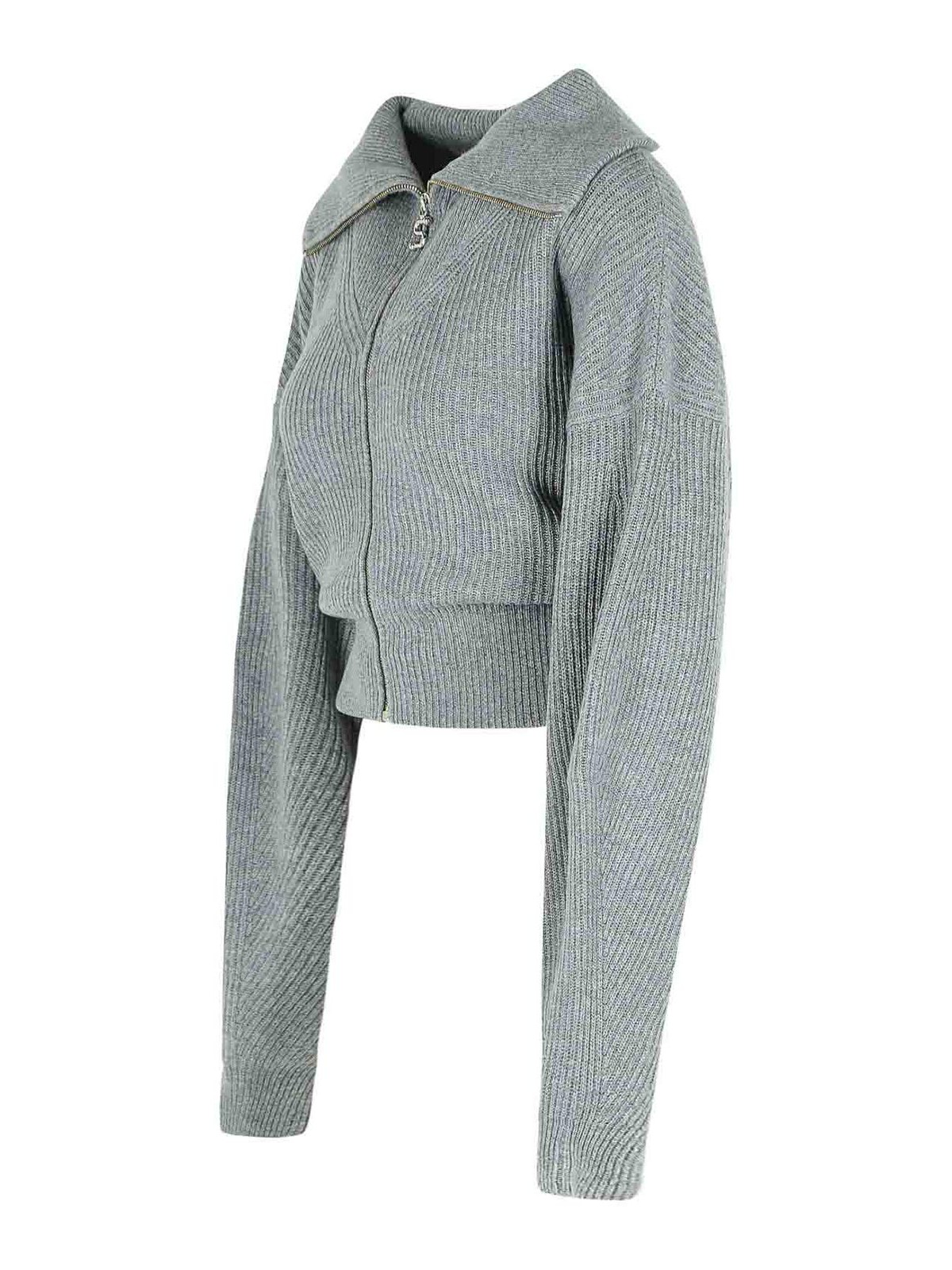 Lana y chaqueta de punto, holgados en el pecho y angostos en la cintura, cuello alto que se puede girar, apertura con cremallera y deslizador personalizado, hombros caídos, mangas anchas que se ajustan a la muñeca.