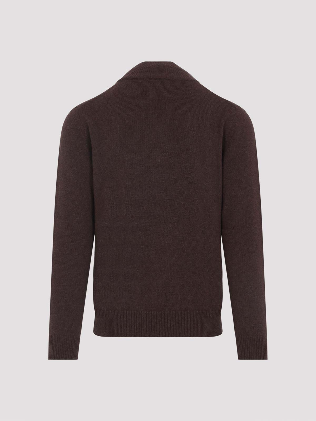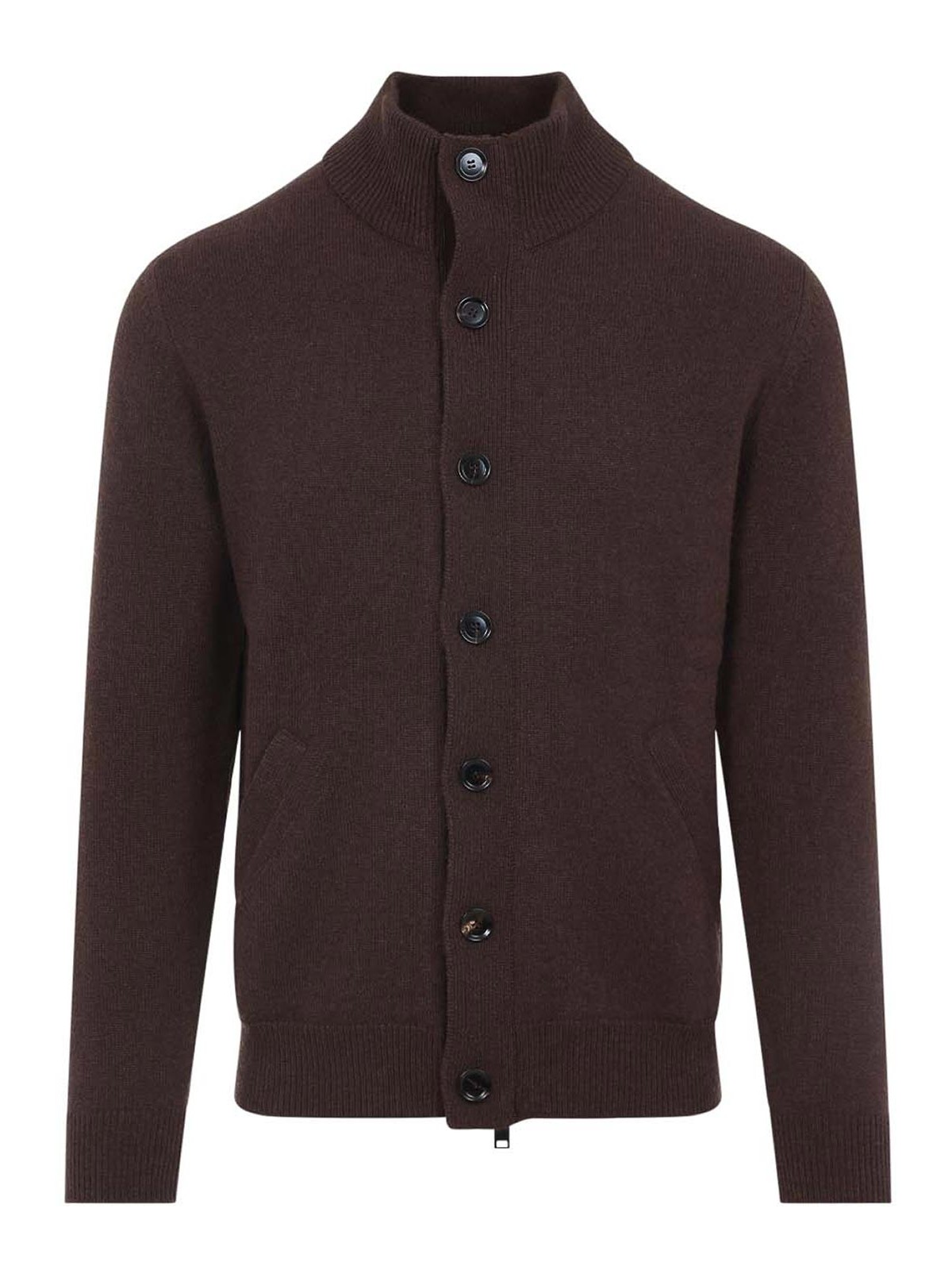 Blusa Brioni de cachemir de caoba marrón con cremallera. Confeccionada en cachemir de caoba marrón puro. Cuello alto acanalado plegable, cierre frontal doble con cremallera y botones, banda en contraste en la línea de cierre de los botones, dobladillo y puños acanalados, dos bolsillos ribeteados laterales, dobladillo recto.