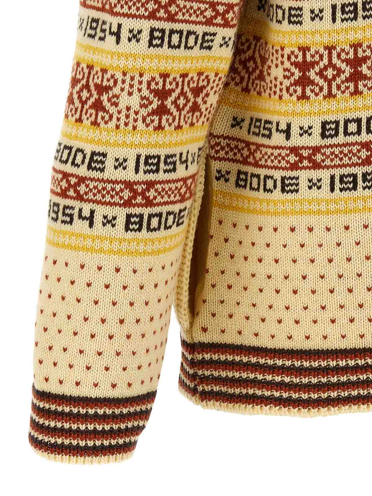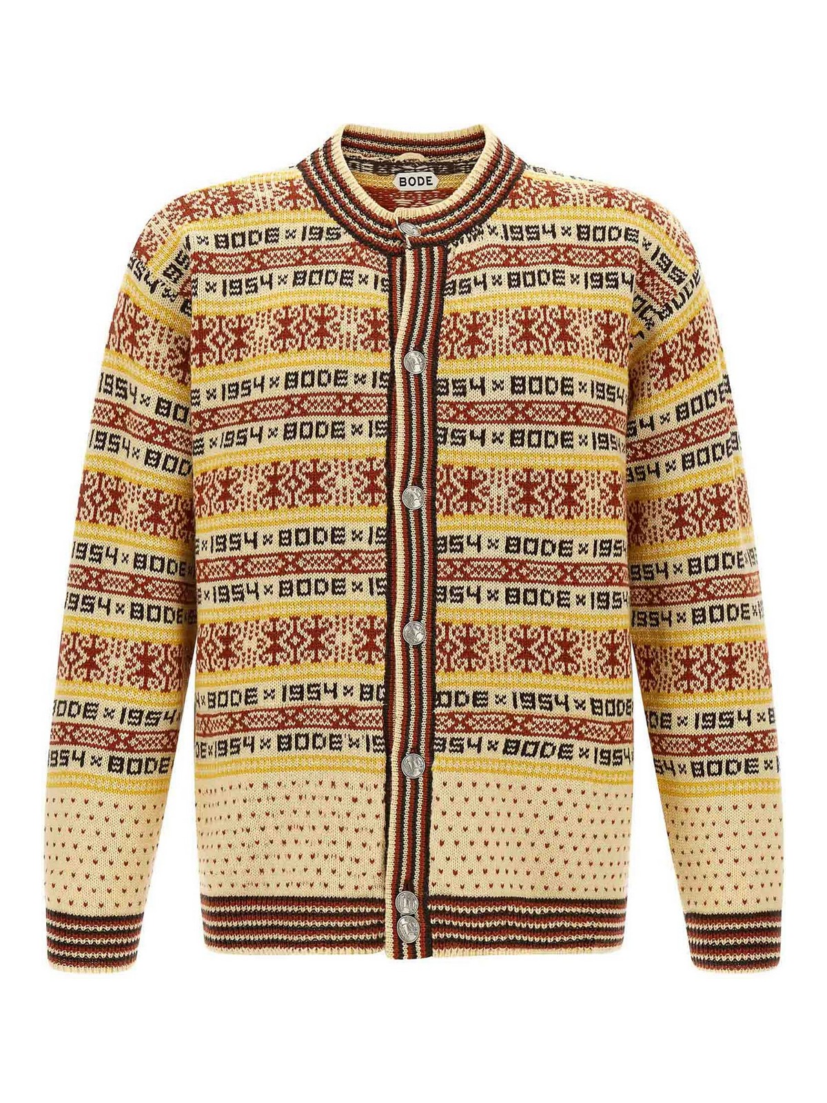 Cárdigan de lana con estampado jacquard de mazapán, cuello redondo, cierre frontal con botones con logotipo metálico, bolsillos, mangas largas con puños y hombros caídos.
