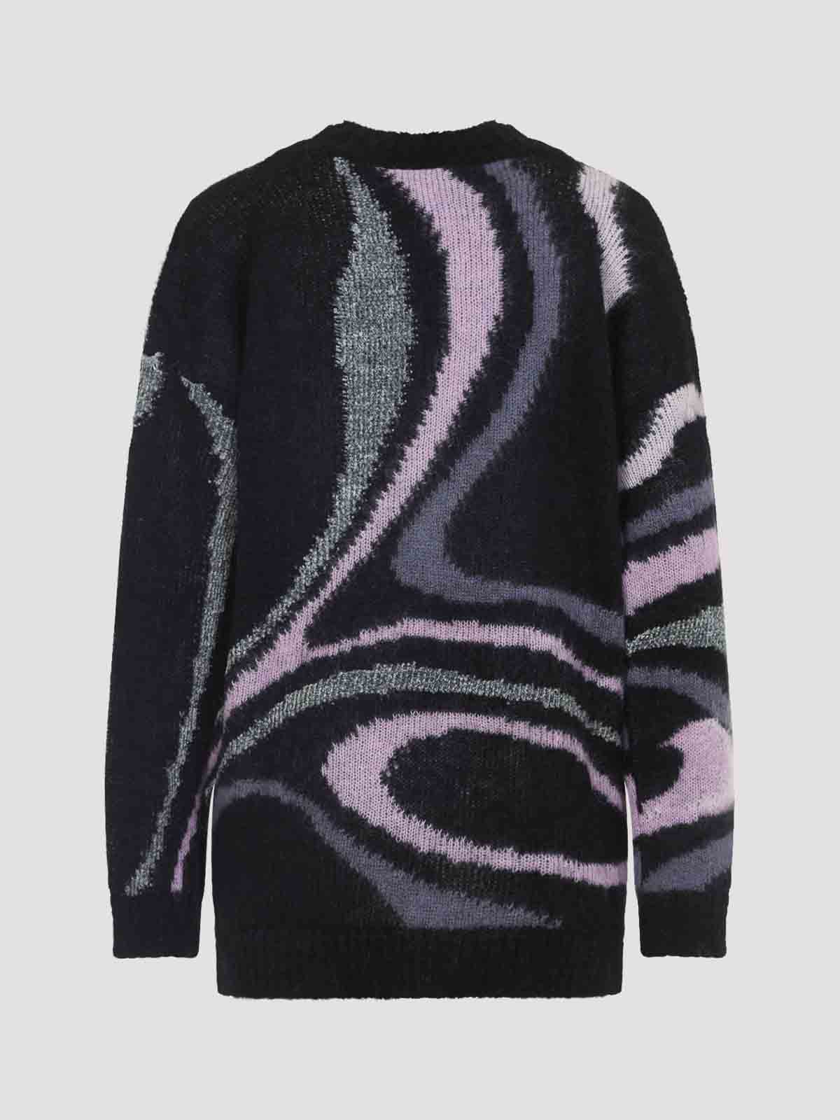 Cárdigan negro Pucci confeccionado y mezcla en V, cuello abotonado, bolsillos laterales, hombros caídos, mangas largas, puños y dobladillo acanalados, dobladillo recto, diseño geométrico blanco y rosa