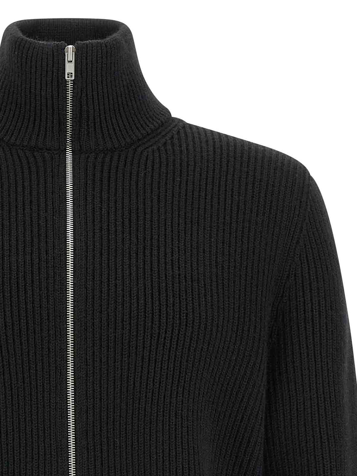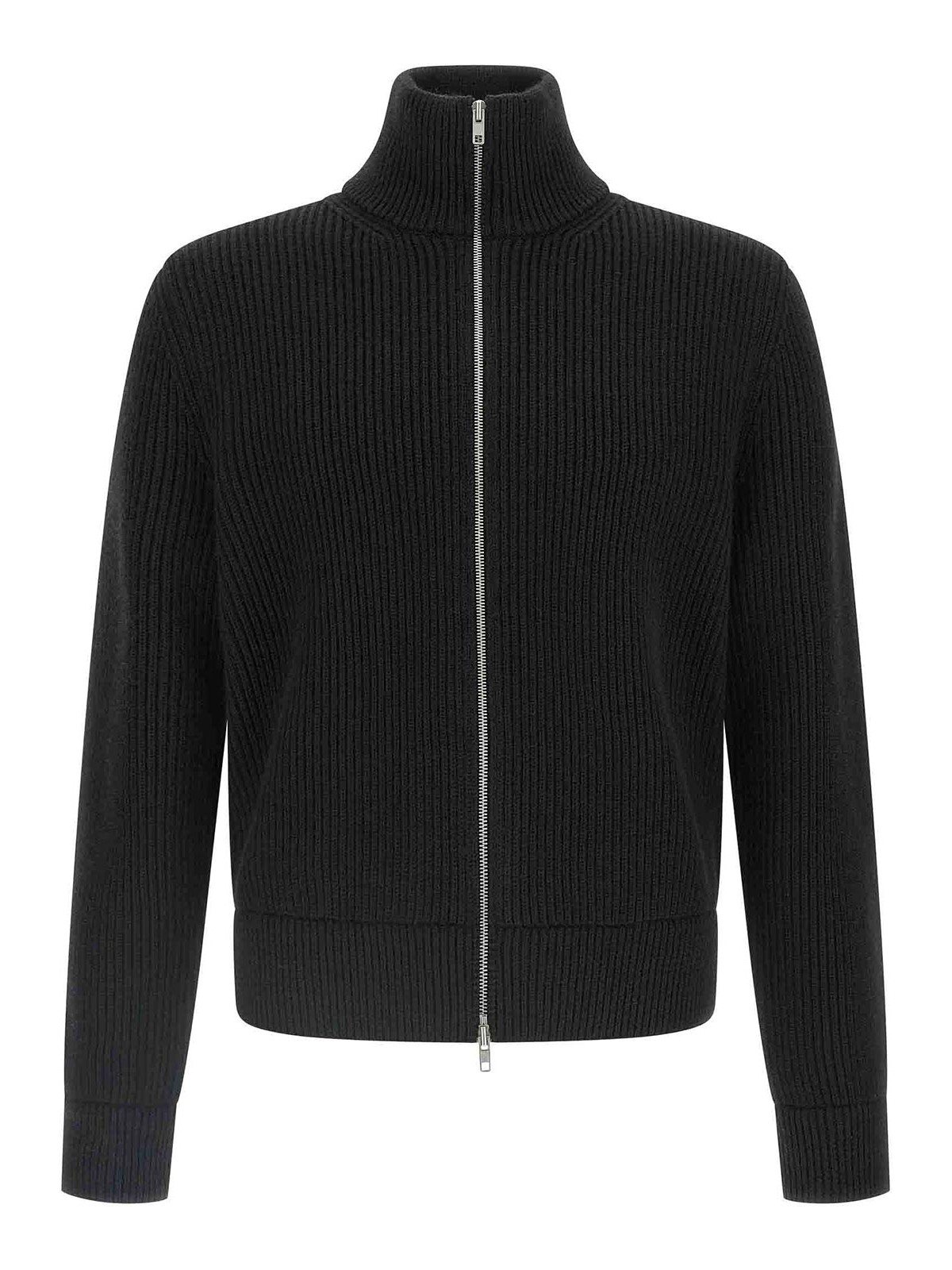 Cárdigan de punto de lana virgen, cuello alto, cierre con cremallera en la parte delantera, mangas largas con puños, cuatro puntos en la espalda.