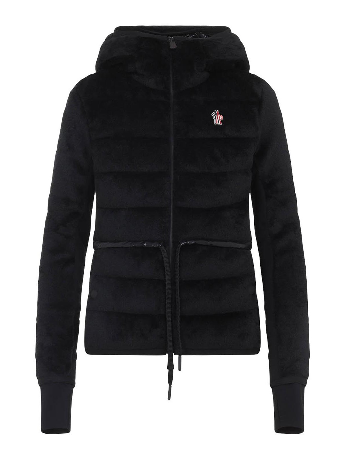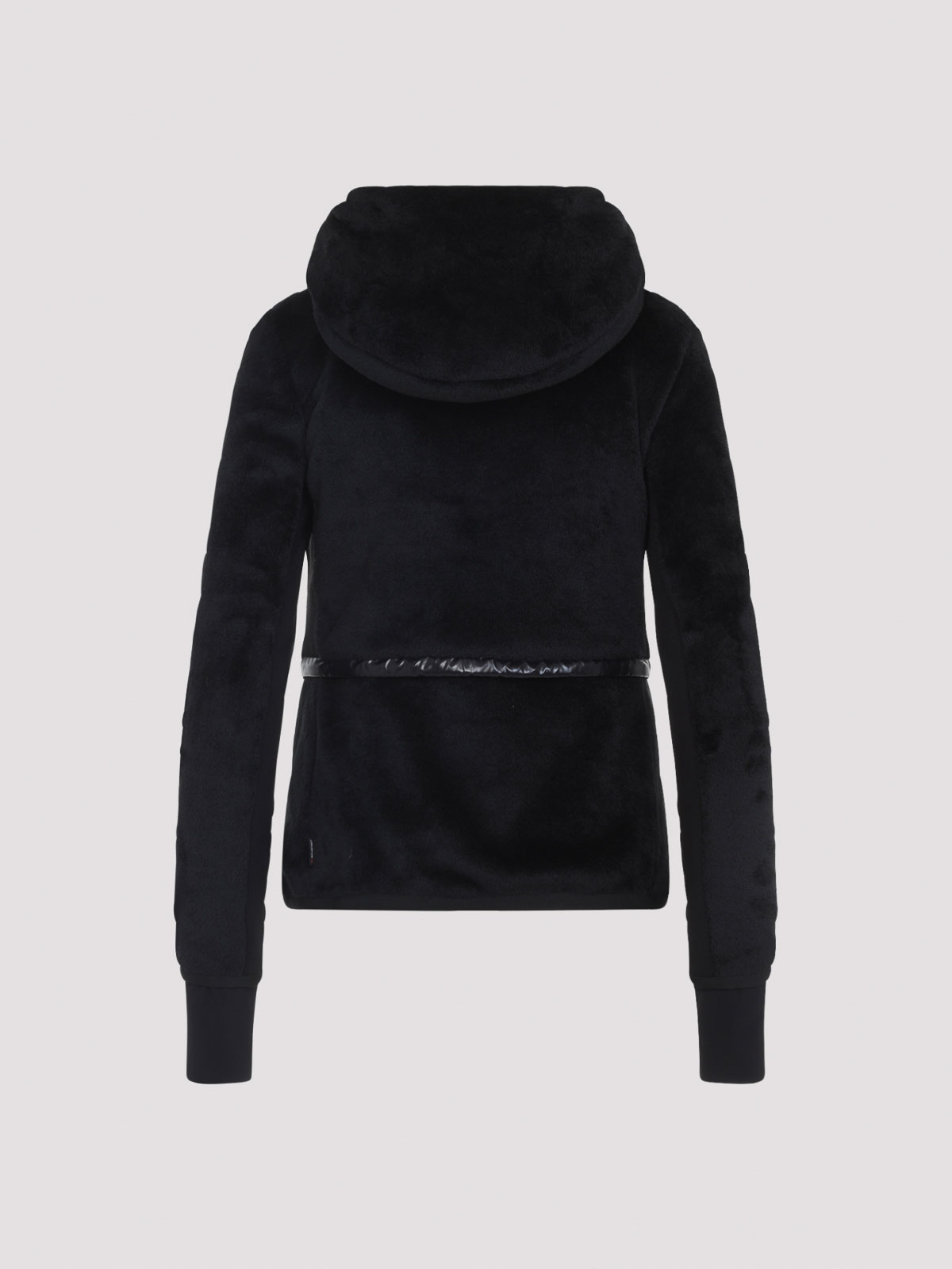 Chaqueta tipo cárdigan Moncler Grenoble negra con cremallera confeccionada y mezcla, capucha tonal, cuello alto, parche en el pecho con cremallera, logotipo, correa tonal en la cintura, bolsillos abotonados, mangas largas, dobladillo recto