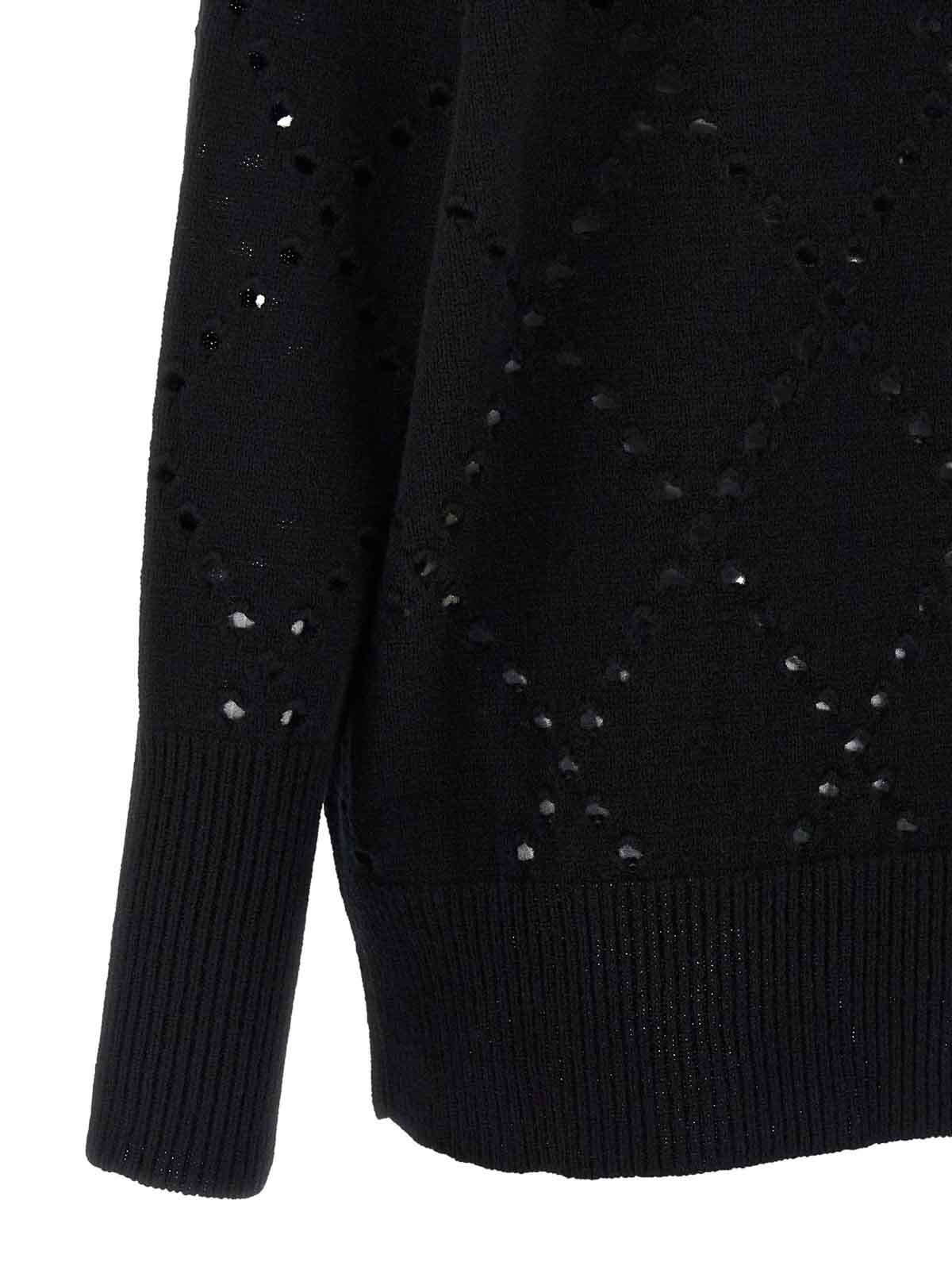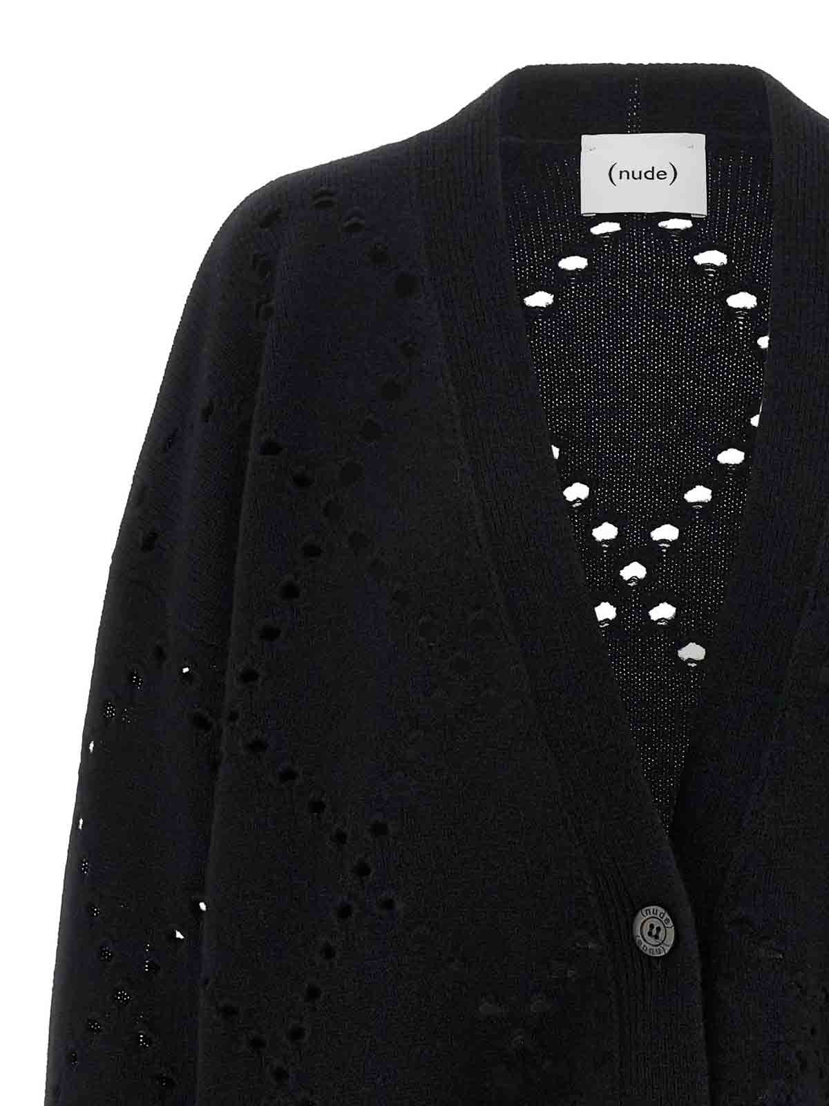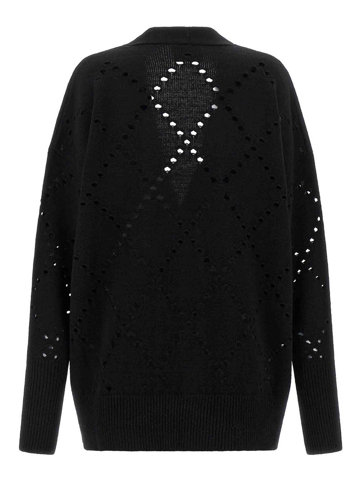 Cárdigan de lana con corte rojizo, estampado en V, cuello y botones, mangas largas con puños y hombros caídos