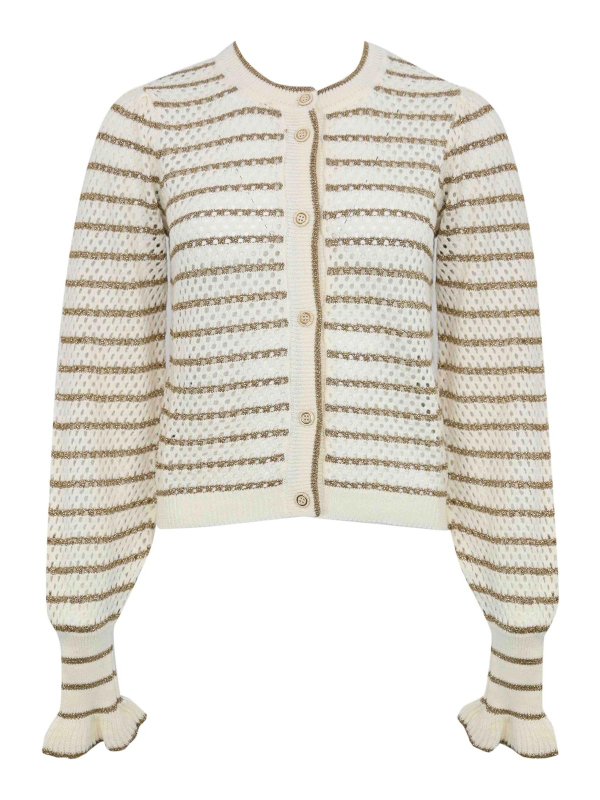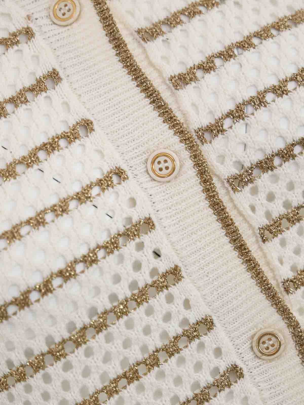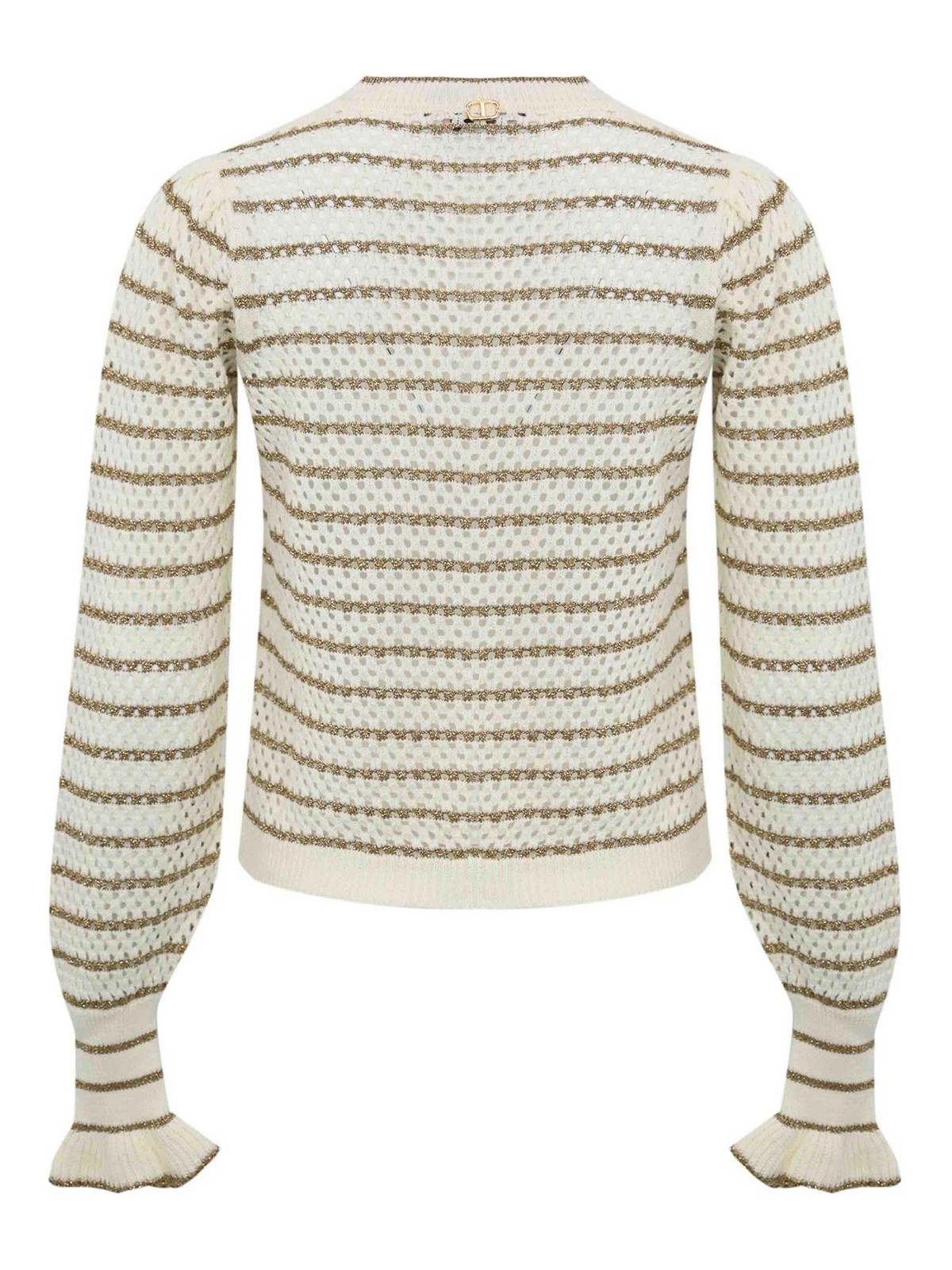 Malla perforada de algodón y mezcla, diseño de rayas horizontales, mangas largas, puños con volantes, cuello redondo, acanalado con botones, corte holgado
