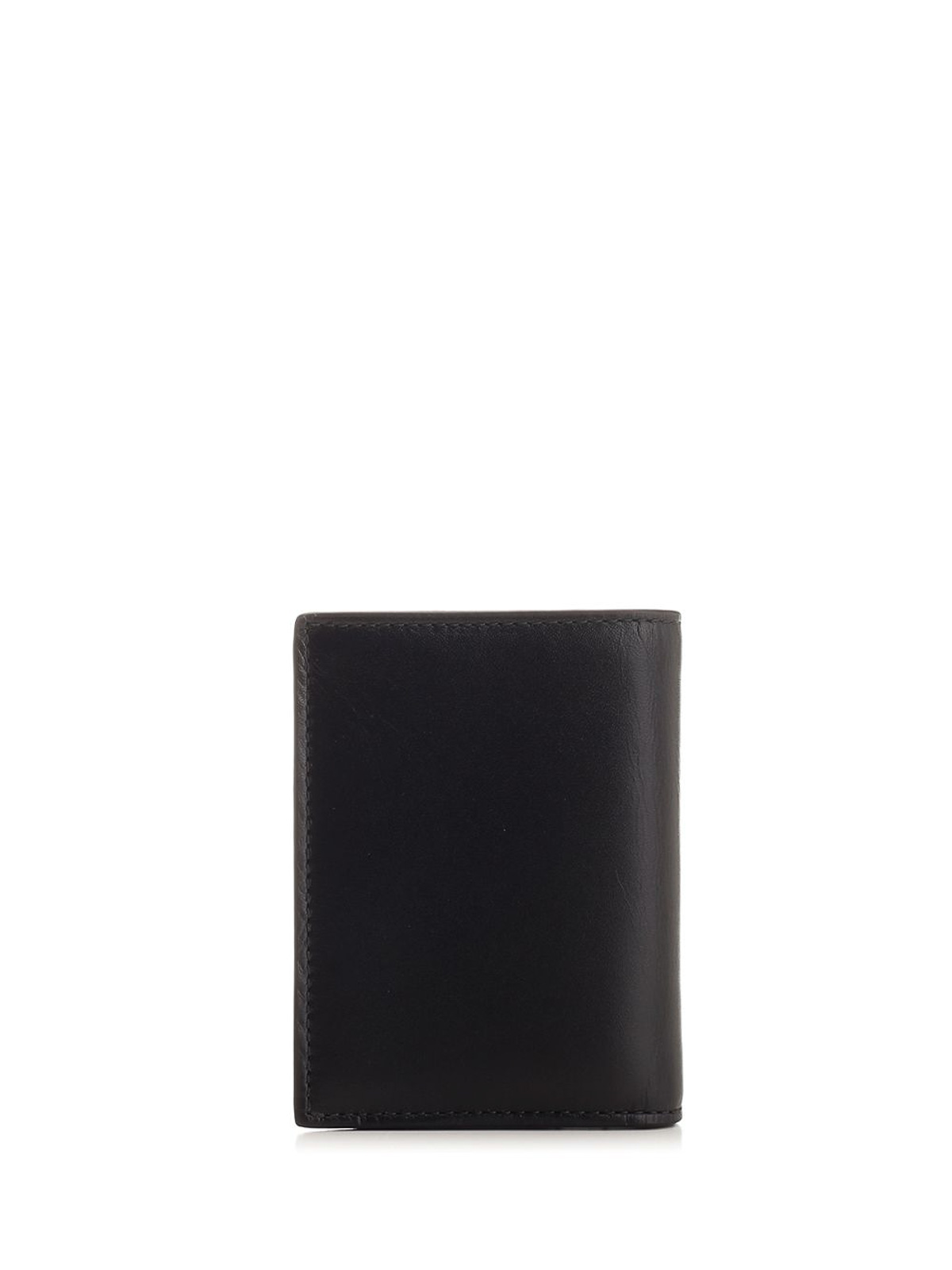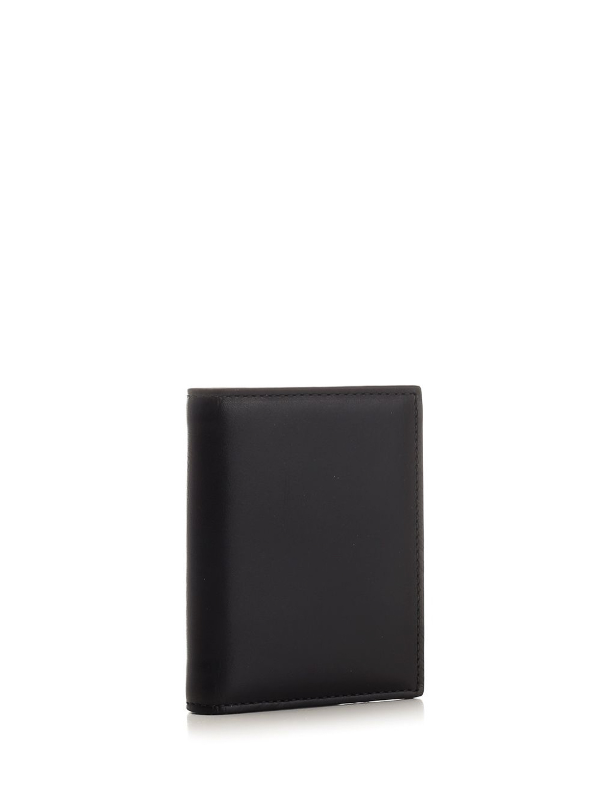 Cartera negra de piel de comme des garcons, interior de lunares, cinco ranuras para tarjetas, un compartimento para billetes.