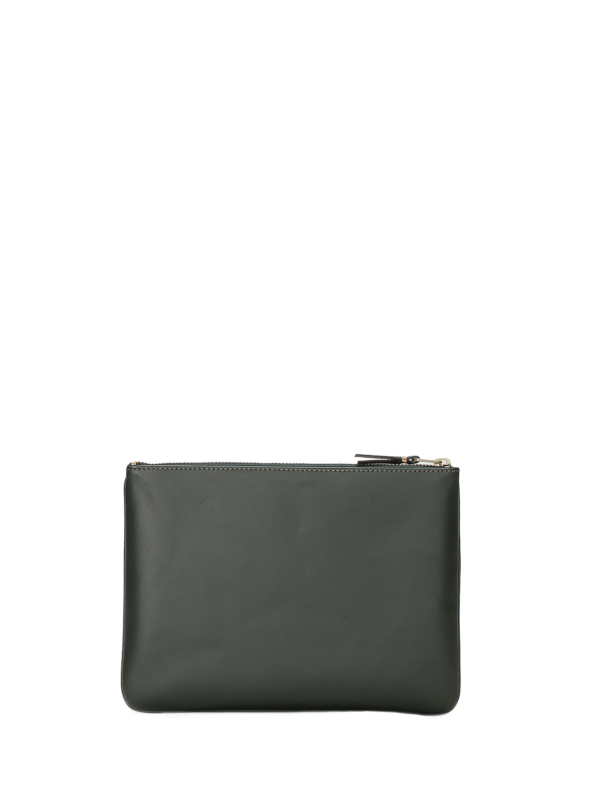 Cartera verde sencilla con cierre de sobre y logotipo frontal dorado, tamaño grande.
