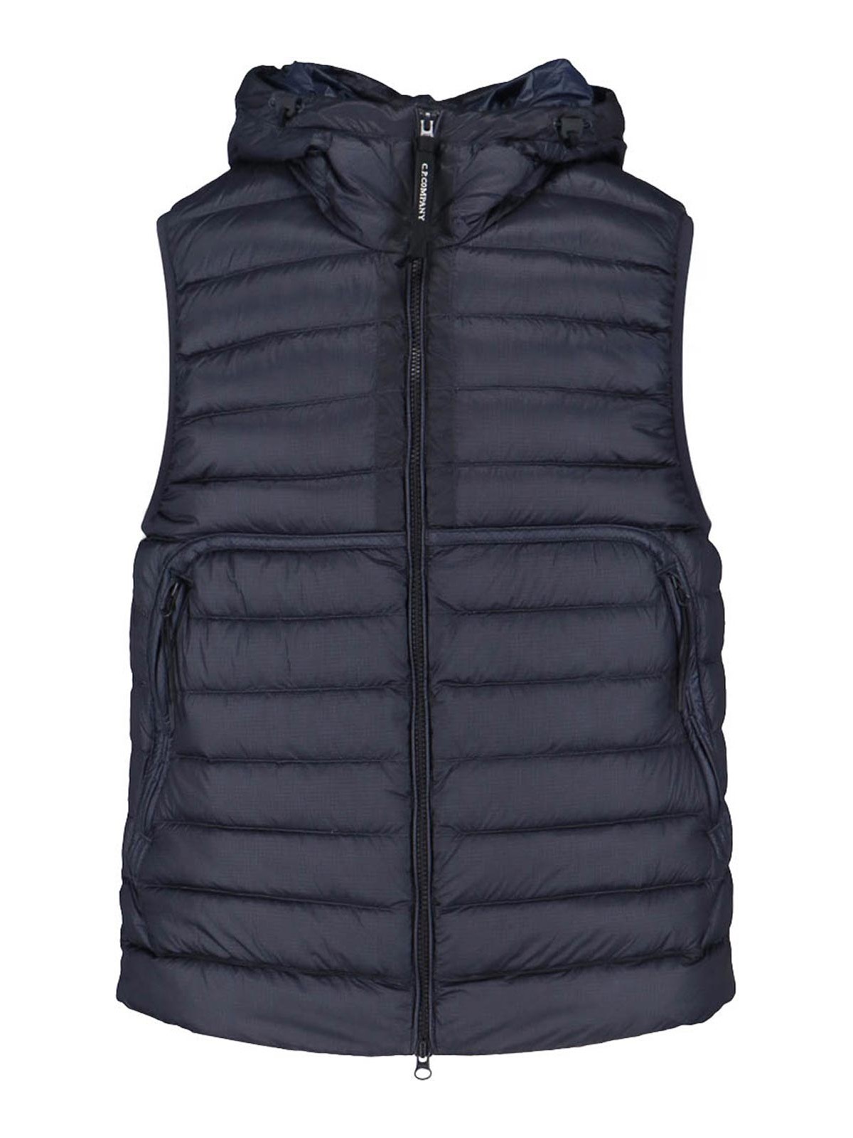 Chaleco acolchado para gafas C.P. Company, en tela d.d., concha azul, diseño acolchado y acolchado, capucha con detalle de lentes, cierre con cremallera, dos bolsillos laterales con cremallera, dobladillo recto.