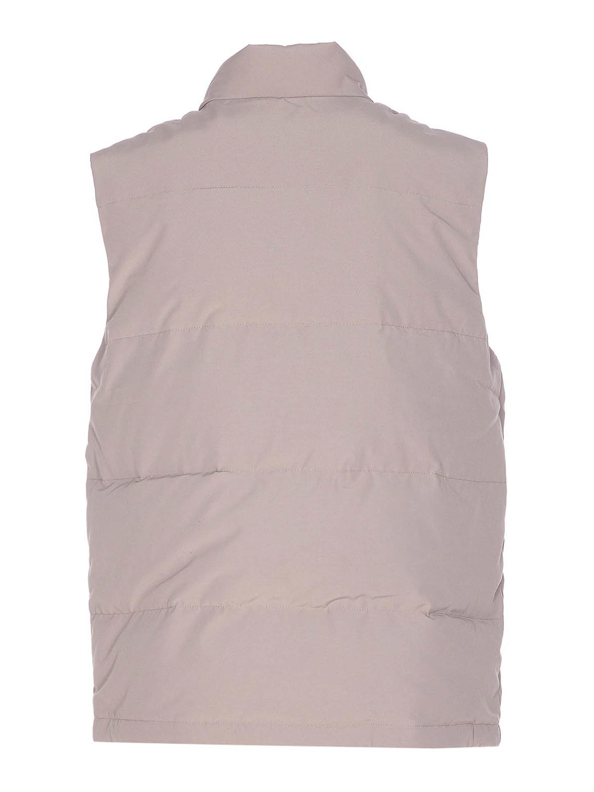 Chaleco acolchado estilo libre de color gris ganso de Canadá con cremallera y botones, logotipo de parche sin mangas en los bolsillos