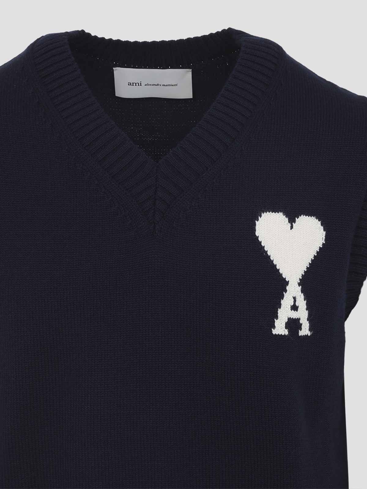 Chaleco Ami de lana y algodón azul. Confeccionado en una mezcla de lana virgen y algodón azul, con escote en V, confección sin mangas, logotipo incrustado en contraste en el pecho y bordes acanalados.