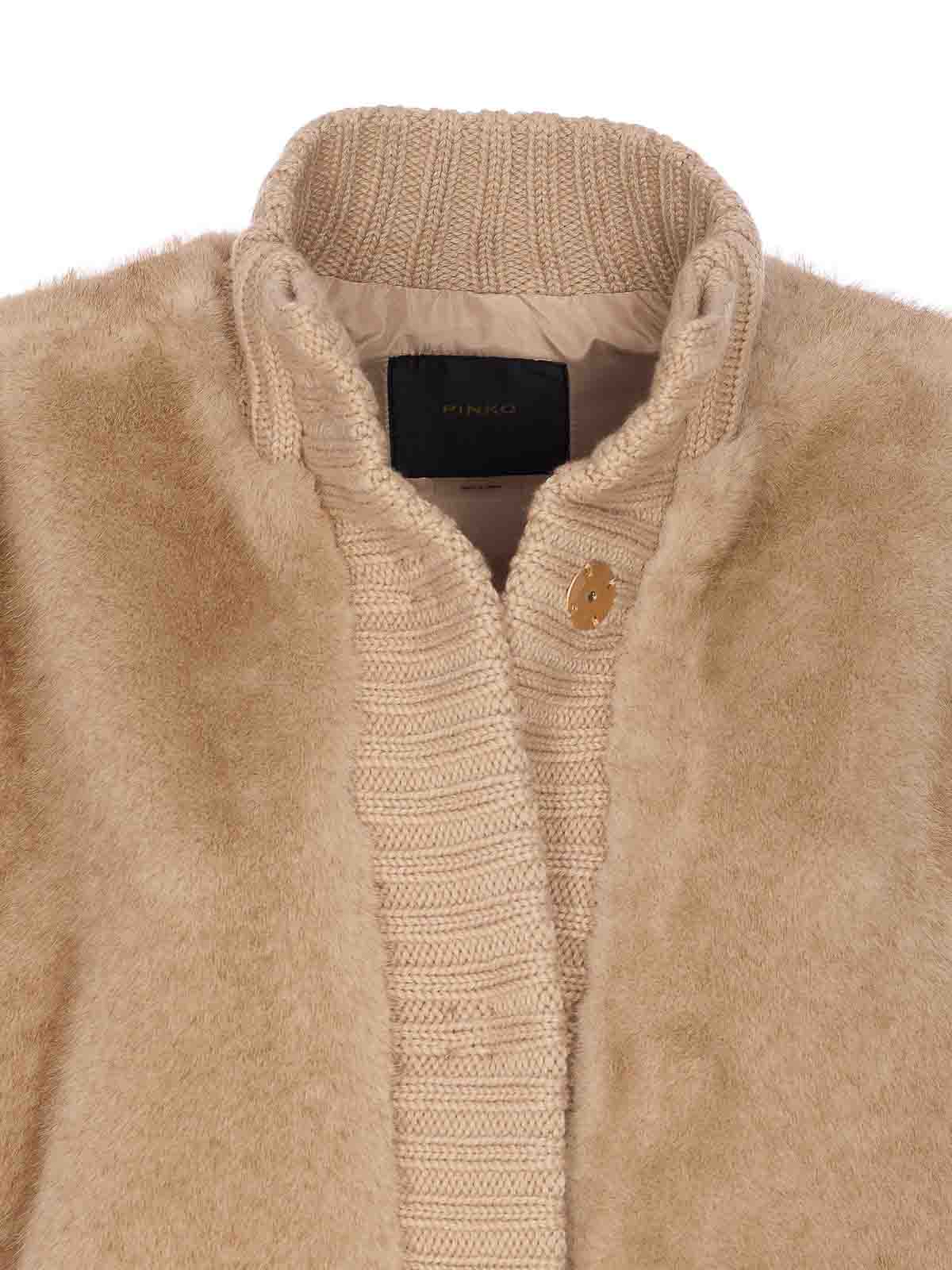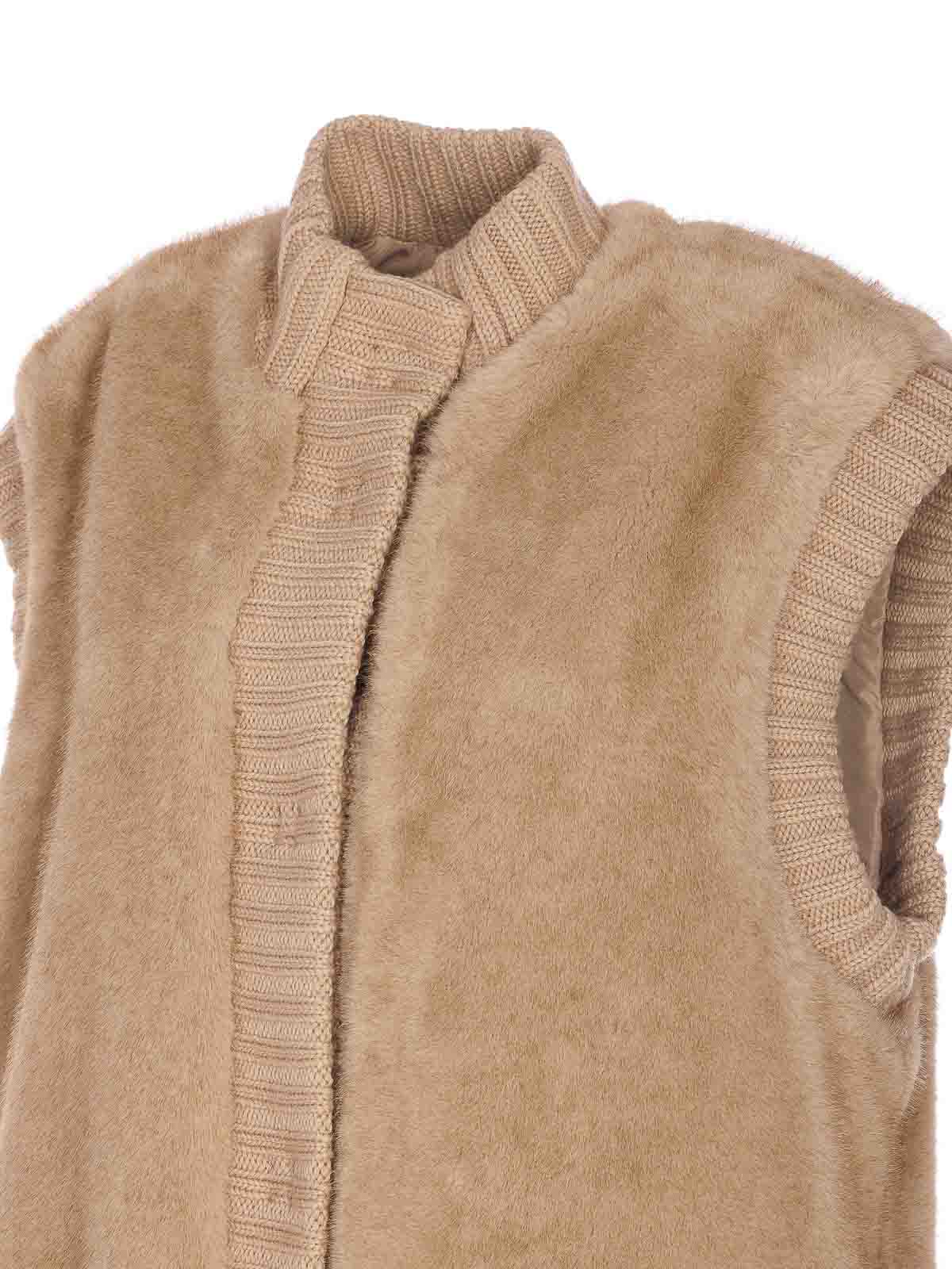 Chaleco rosa beige, detalle de piel sintética, modelo largo, cierre con botones, detalle de punto, bolsillos laterales