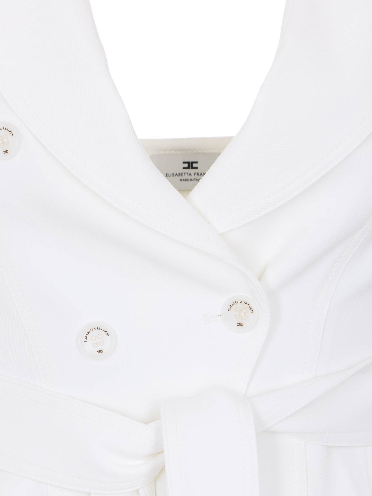 Chaleco blanco Elisabetta ftanchi, cierre con botones de doble botonadura, cinturón en la cintura con logotipo de placa, abierto en la parte posterior