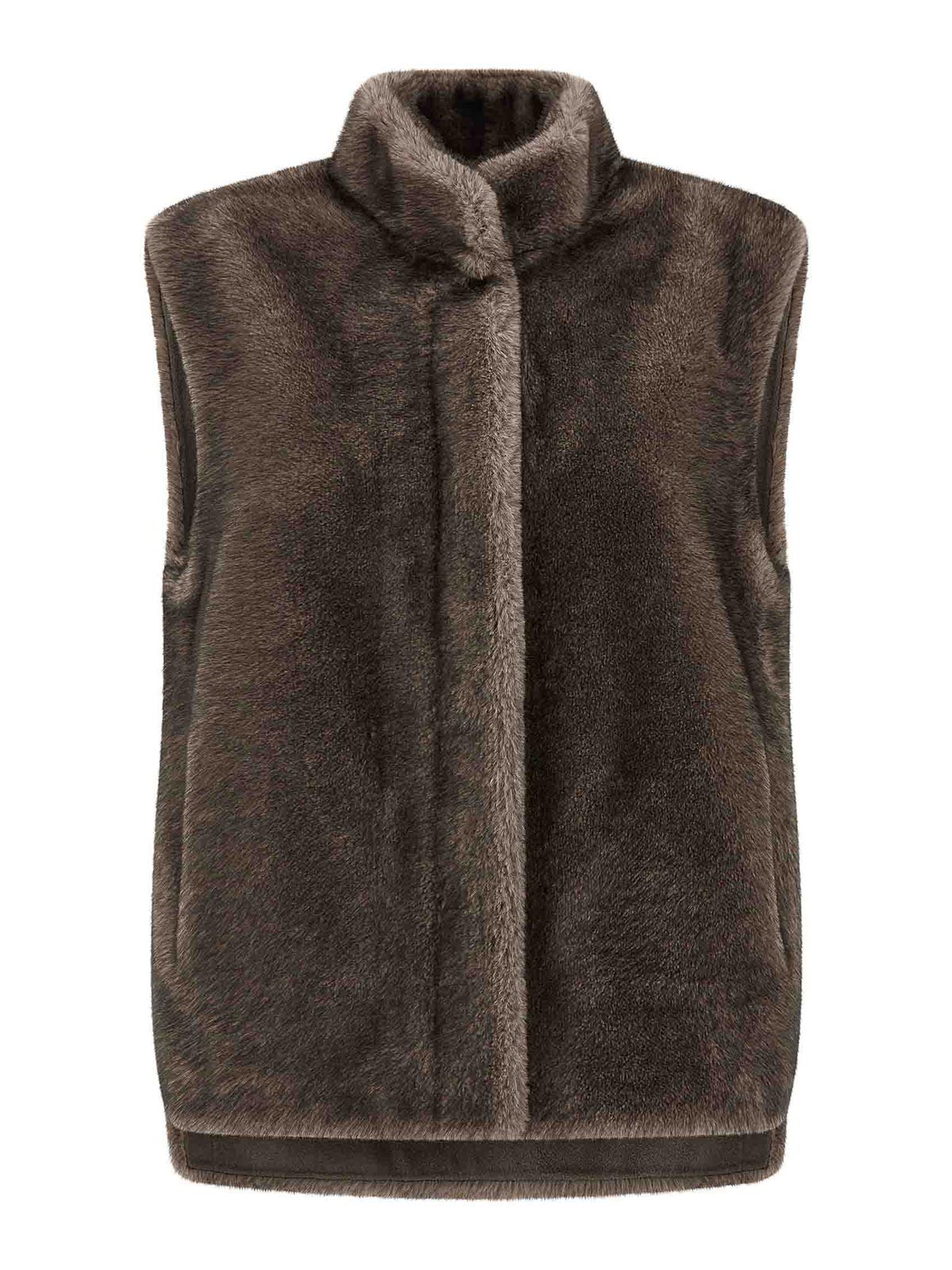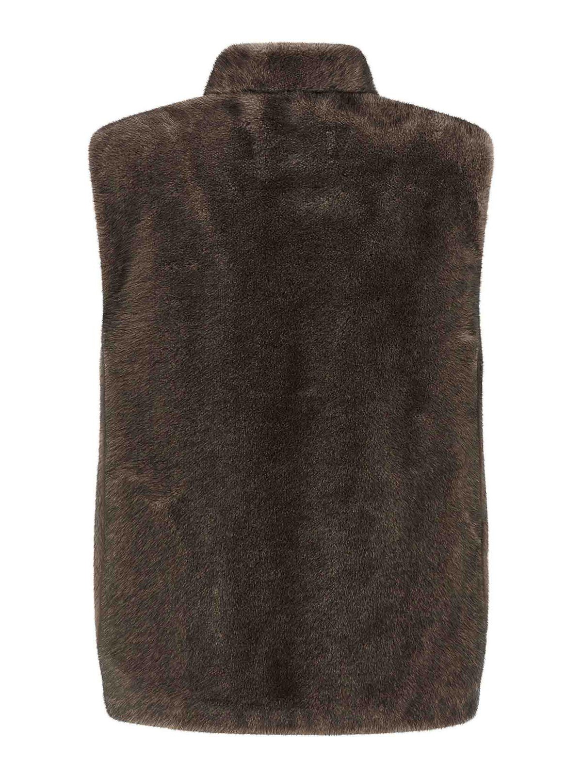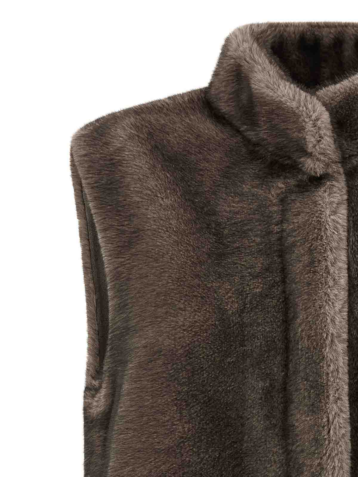 Chaleco de piel sintética con efecto visón, cuello alto, cierre frontal con cremallera y botón a presión, bolsillos, aberturas laterales anchas, dobladillo asimétrico, sin forro.