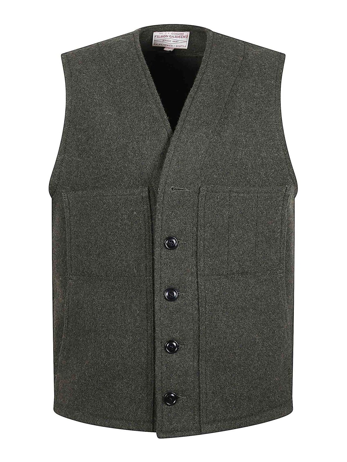Chaleco de lana verde bosque, cierre con botones, bolsillos tipo canguro, bolsillos de parche en el pecho.