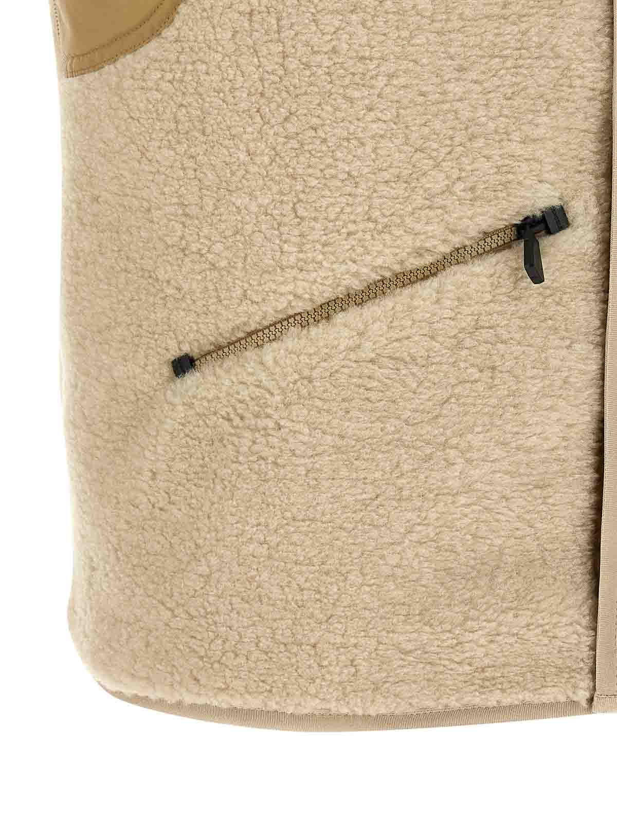 Chaleco polar con efecto peluche con inserciones de algodón cambray de tres capas, forro de malla técnica transpirable, cuello alto con forro de pana en contraste, parche con el logotipo y cierre frontal con botones a presión, bolsillos.