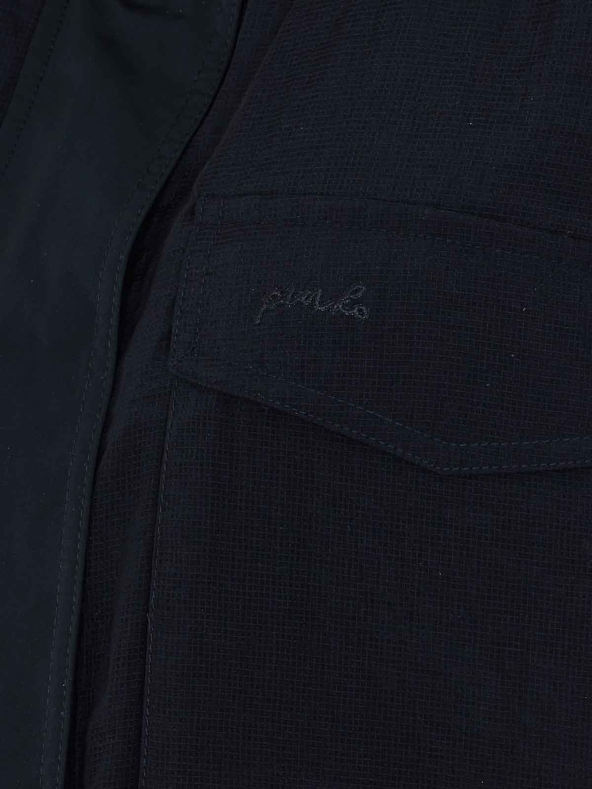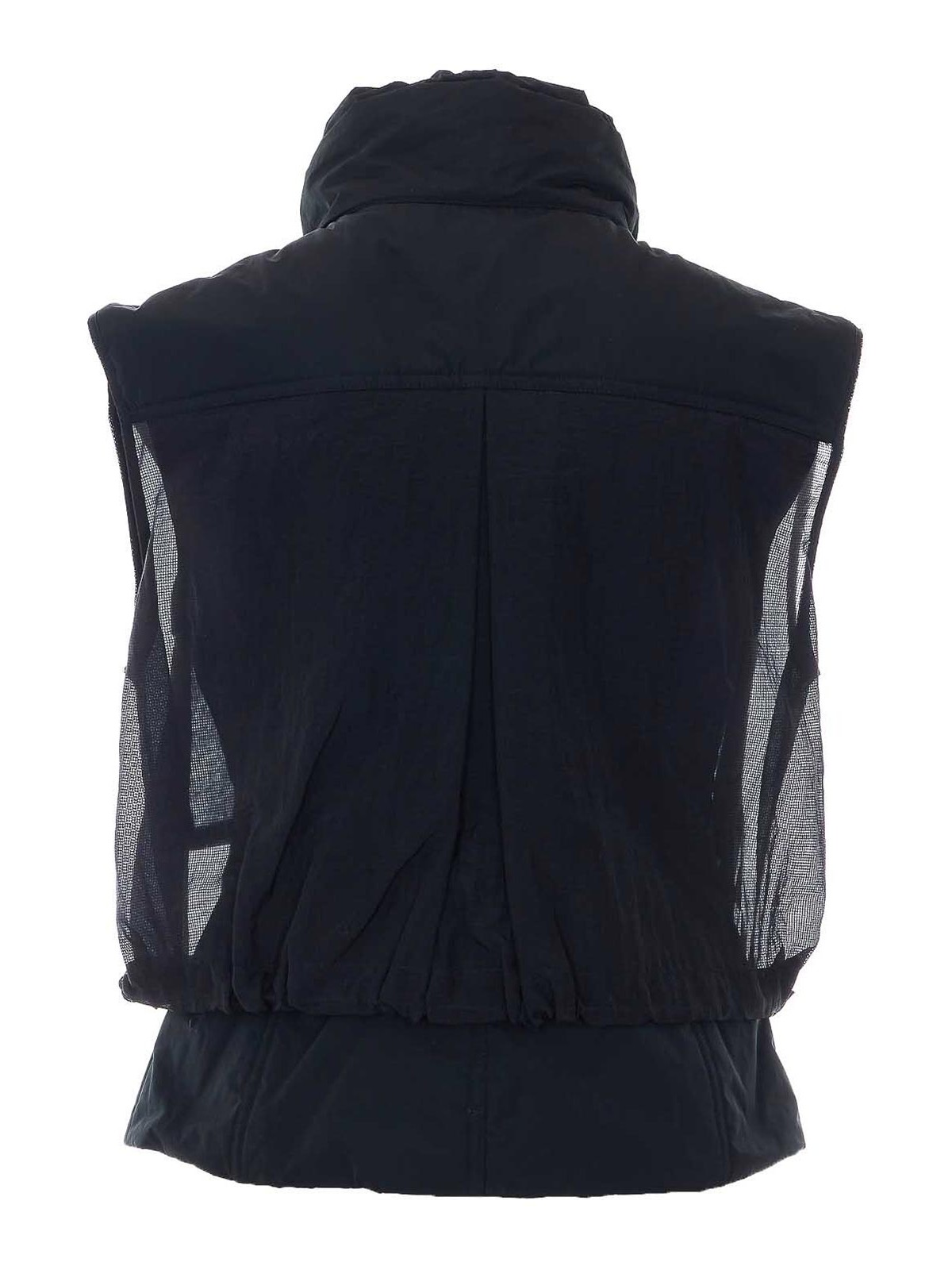 Chaleco geraldine rosa negro con cierre frontal con cremallera y botones, bolsillos laterales con cremallera, cuello alto, bolsillo con bordado en la parte delantera