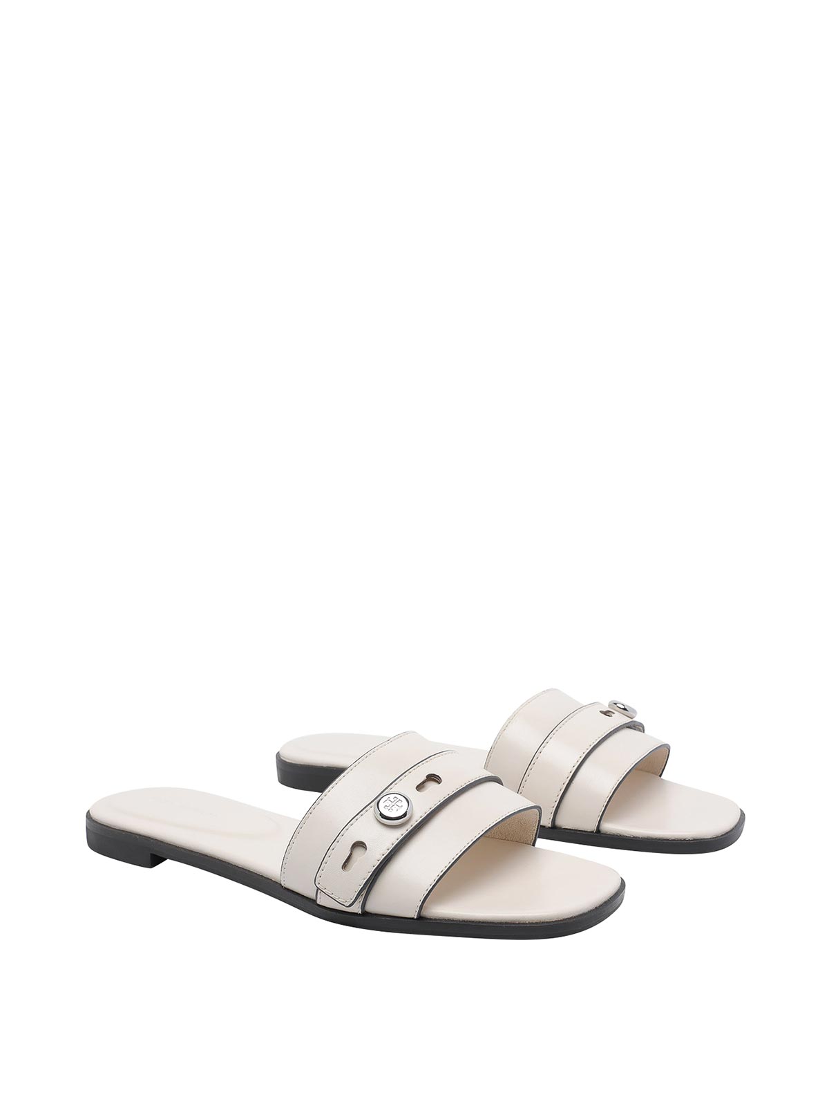 Sandalias Romy blancas Tory Burch, punta redonda, detalle lateral, parte superior de piel