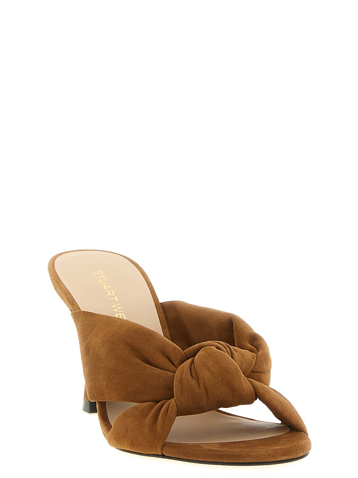 sandalias de gamuza Soplaya con punta redondeada, detalle de nudo en la parte delantera, tacón escultórico cubierto y suela de piel.