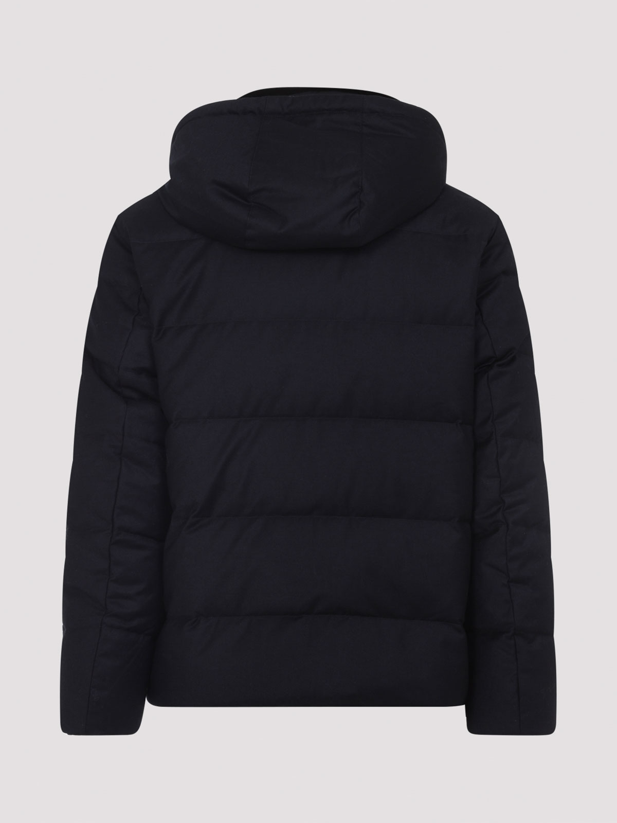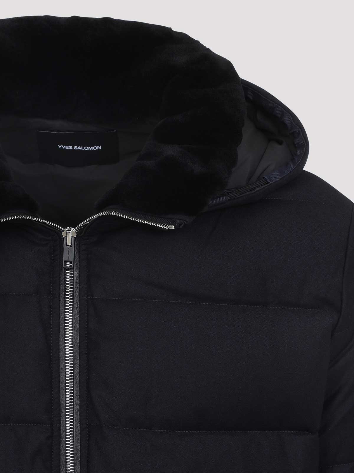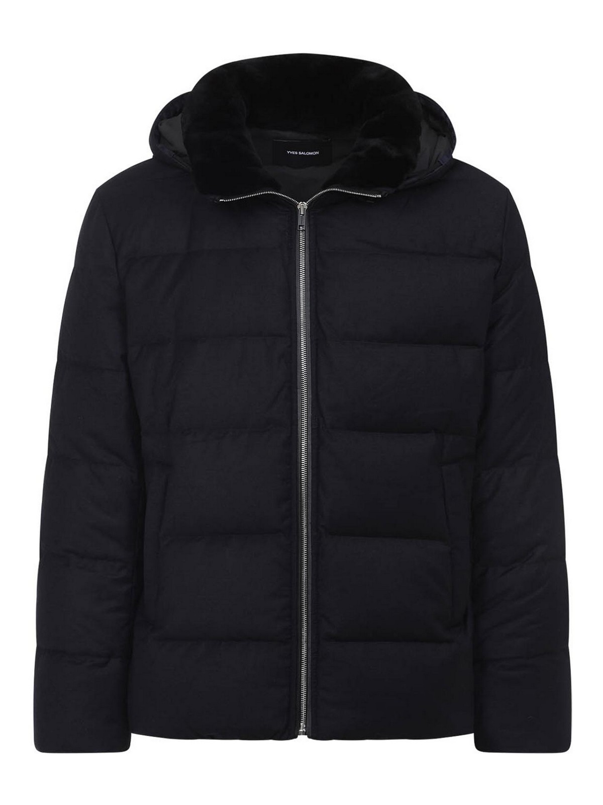 Chaqueta de visón azul Yves Salomon confeccionada en azul oscuro y estampado acolchado, capucha rellena con cordón y visón tonal, bolsillos laterales con cremallera y dobladillo recto