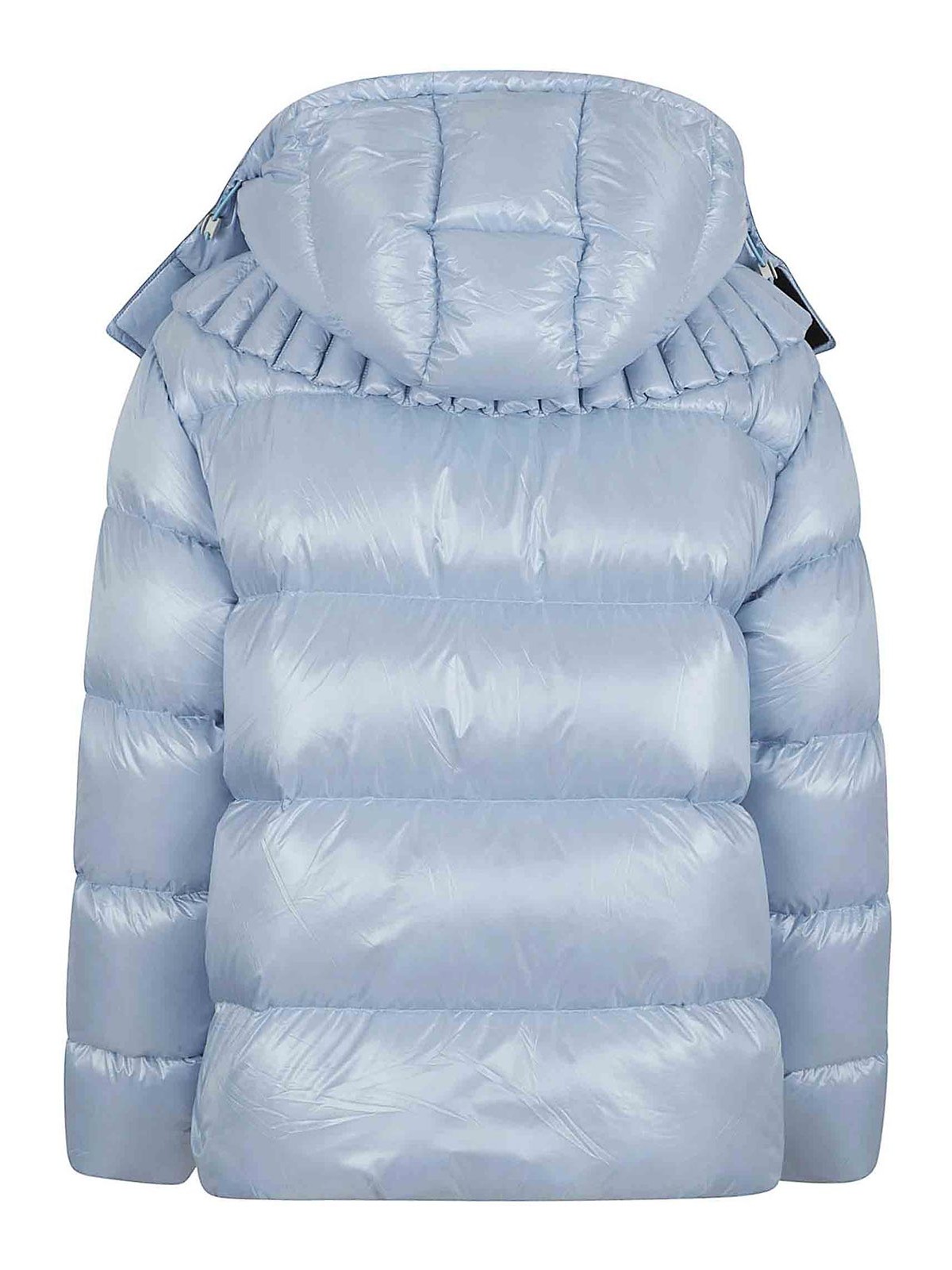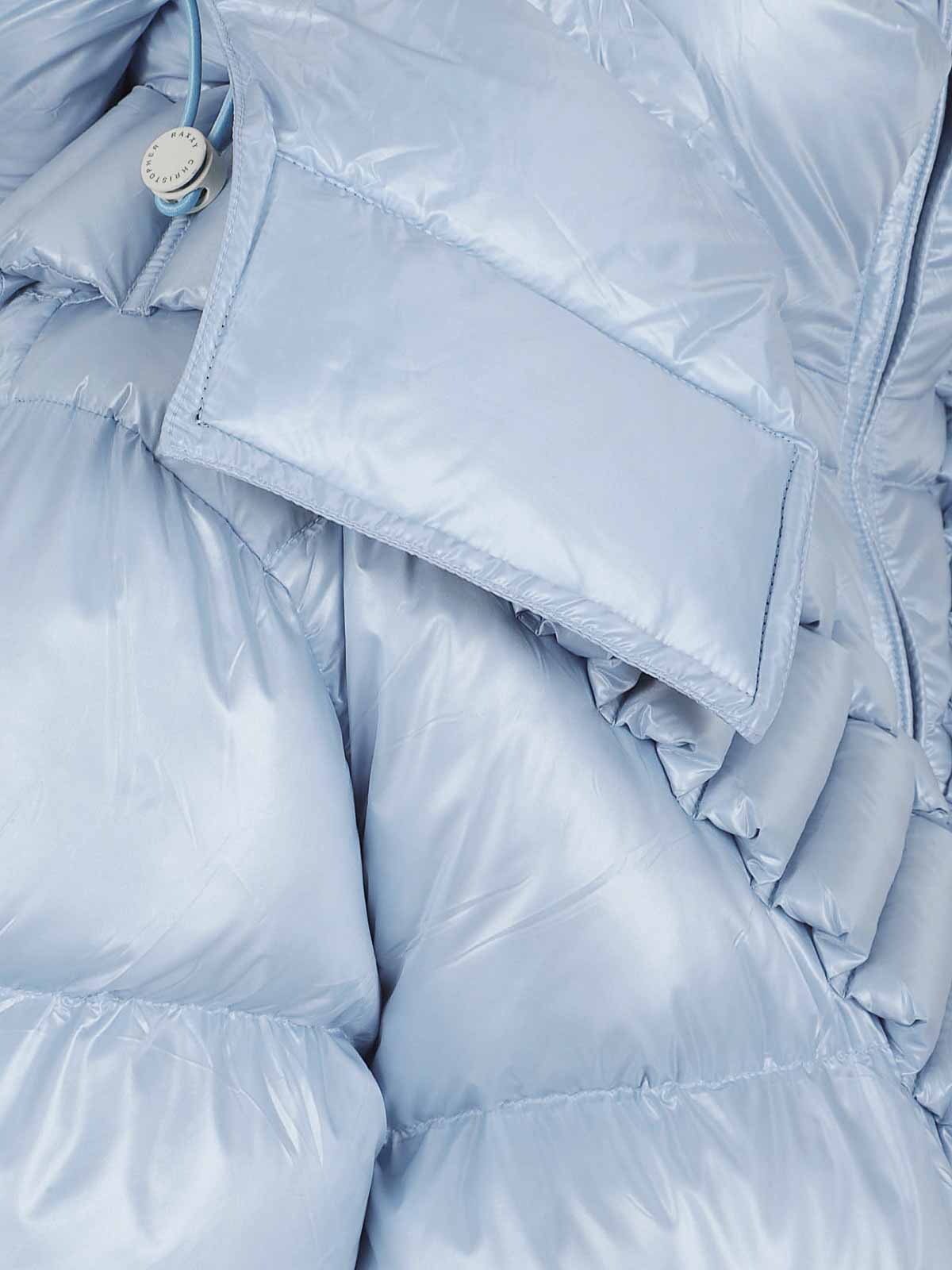 Diseño acolchado con capucha con volantes azul cielo, cierre de cremallera y detalle de solapa