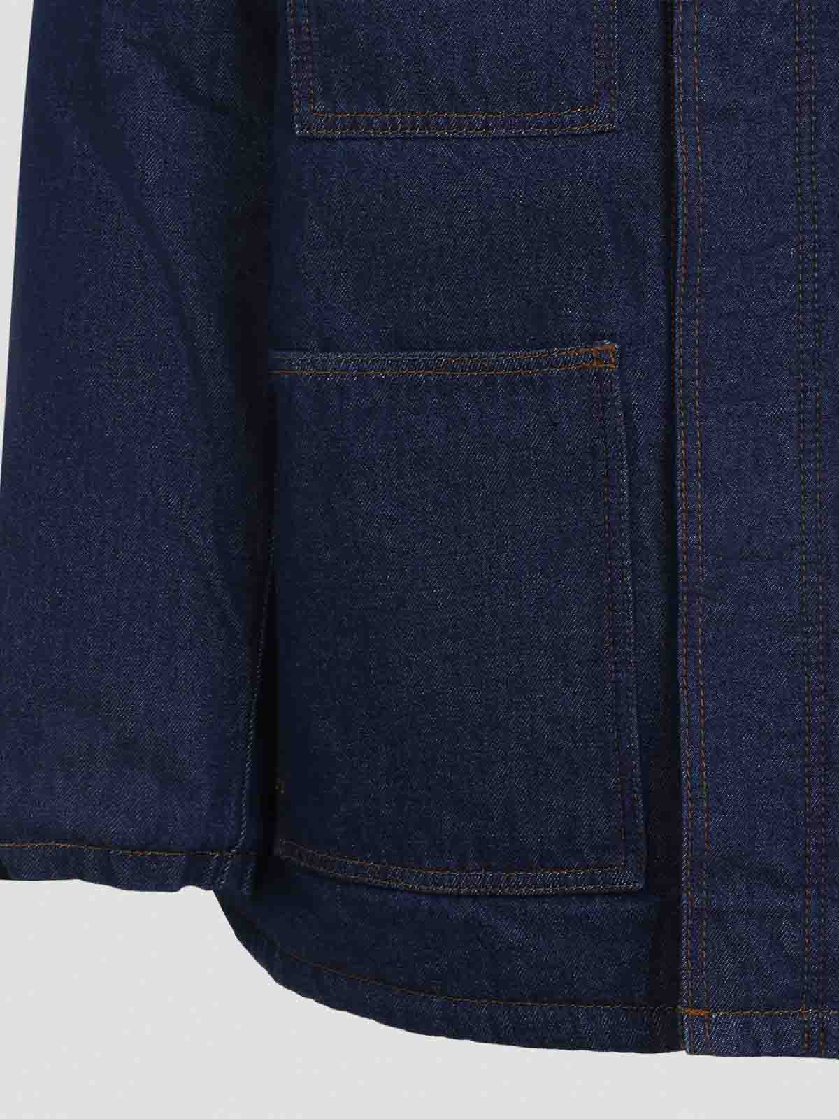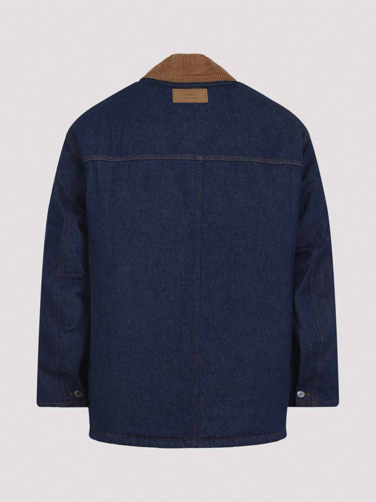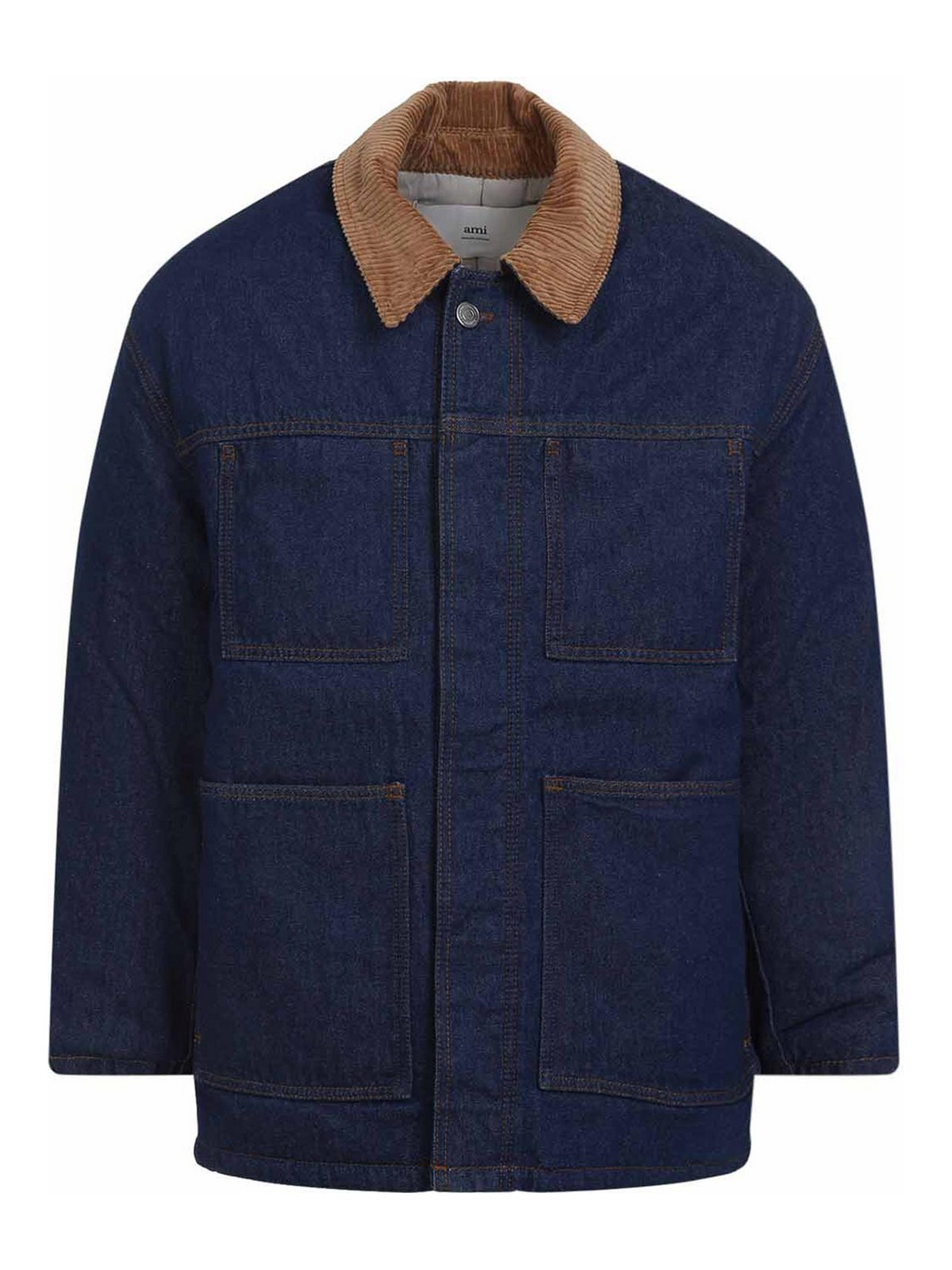 Chaqueta de trabajo acolchada azul índigo Ami, chaqueta azul índigo puro, cuello puntiagudo marrón contrastante que oculta el pecho, bolsillos laterales, mangas largas, puños abotonados, dobladillo recto, diseño acolchado