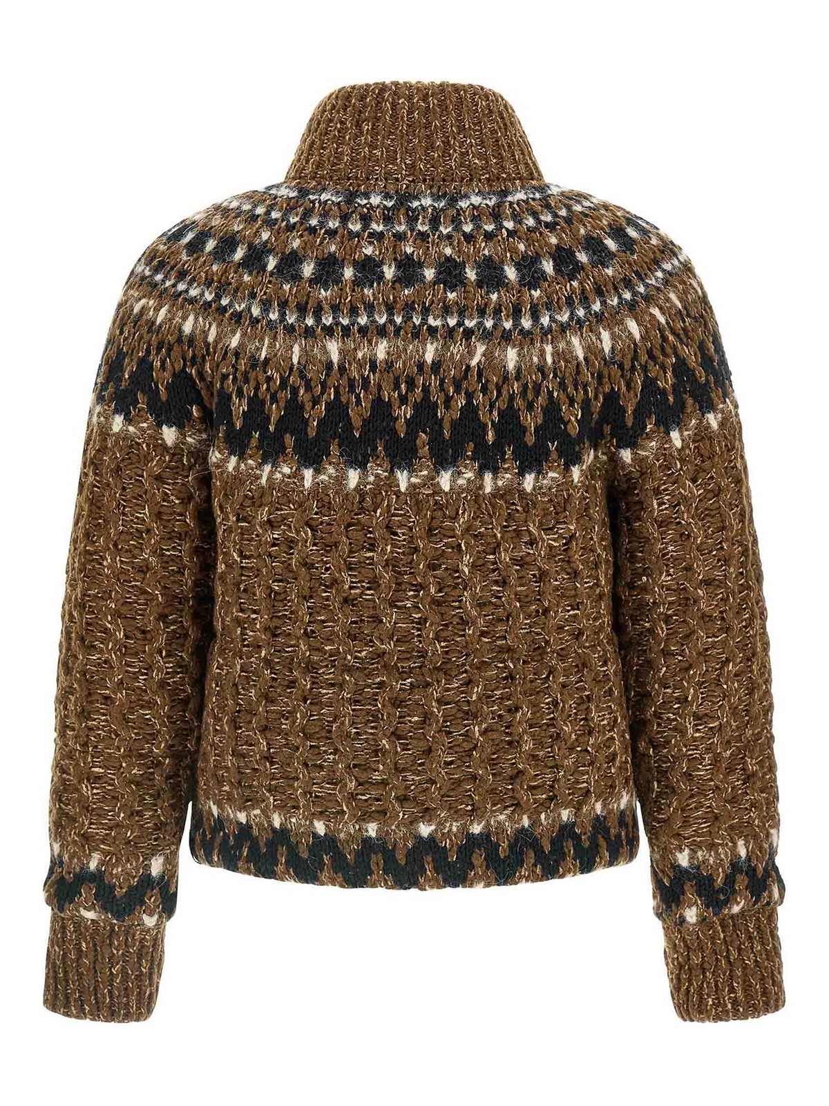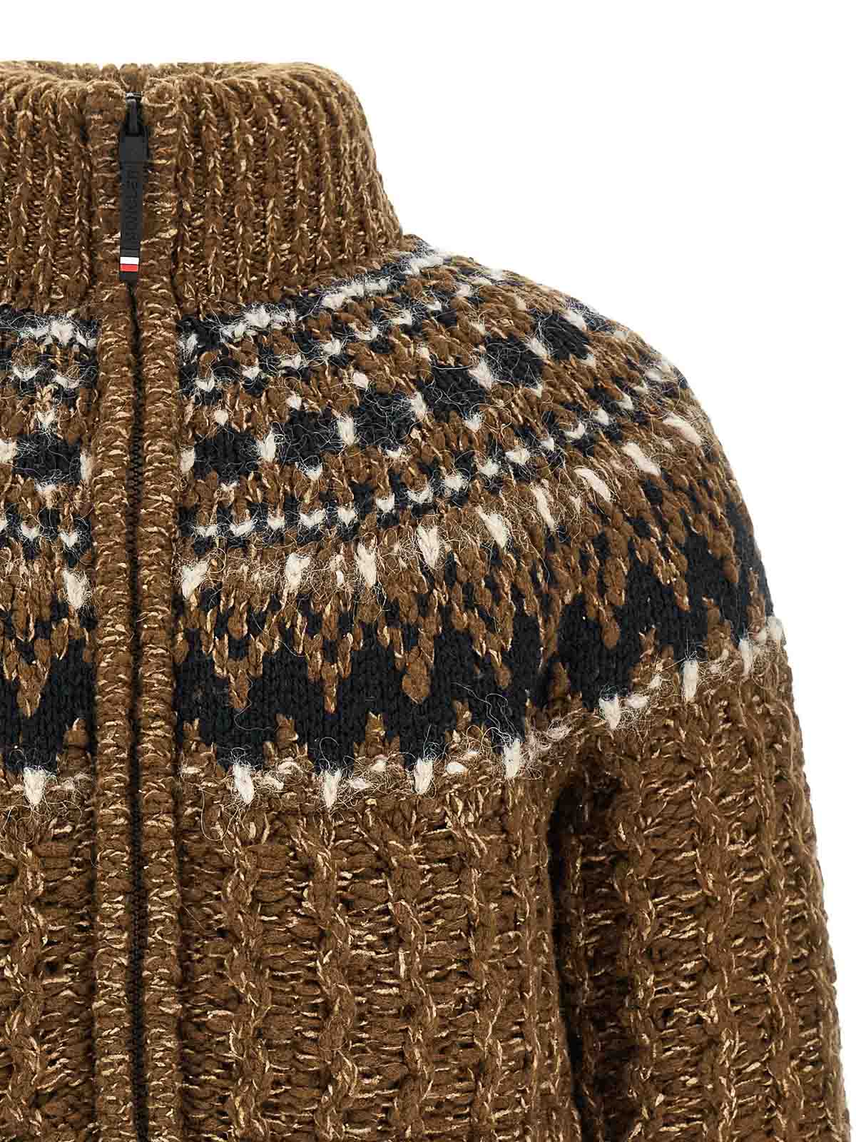chaqueta de punto para hombre en mezcla de lana texturizada con estampado de jacquard geométrico 1.5, forro de nailon lacado con acolchado de pluma de ganso, cuello alto, cierre frontal con cremallera, bolsillos, mangas largas con puños y apliques de parche con el logotipo.