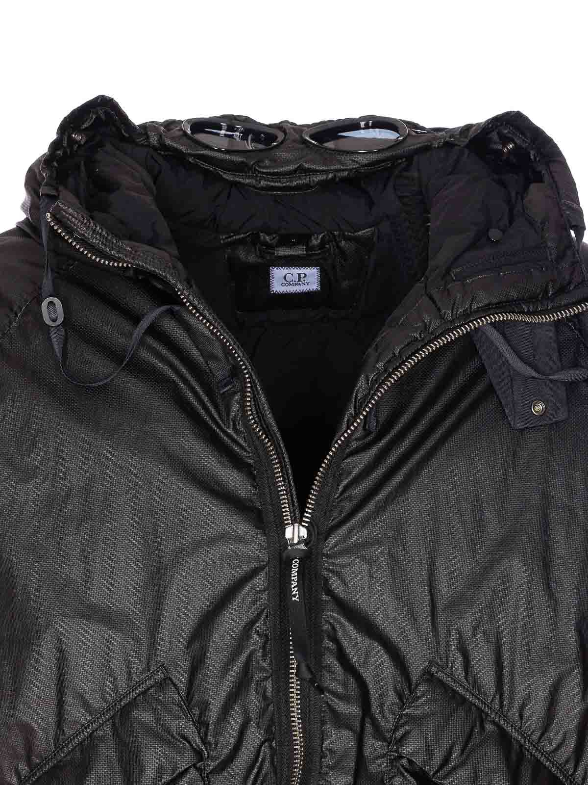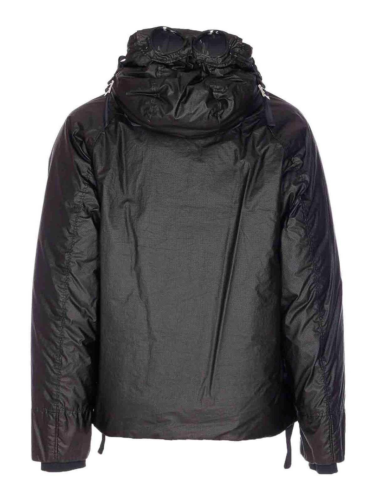Chaqueta exterior negra de C.P. company con cierre frontal con cremallera, capucha con logotipo de parche, manga larga, bolsillos, elástica en los puños, acolchada