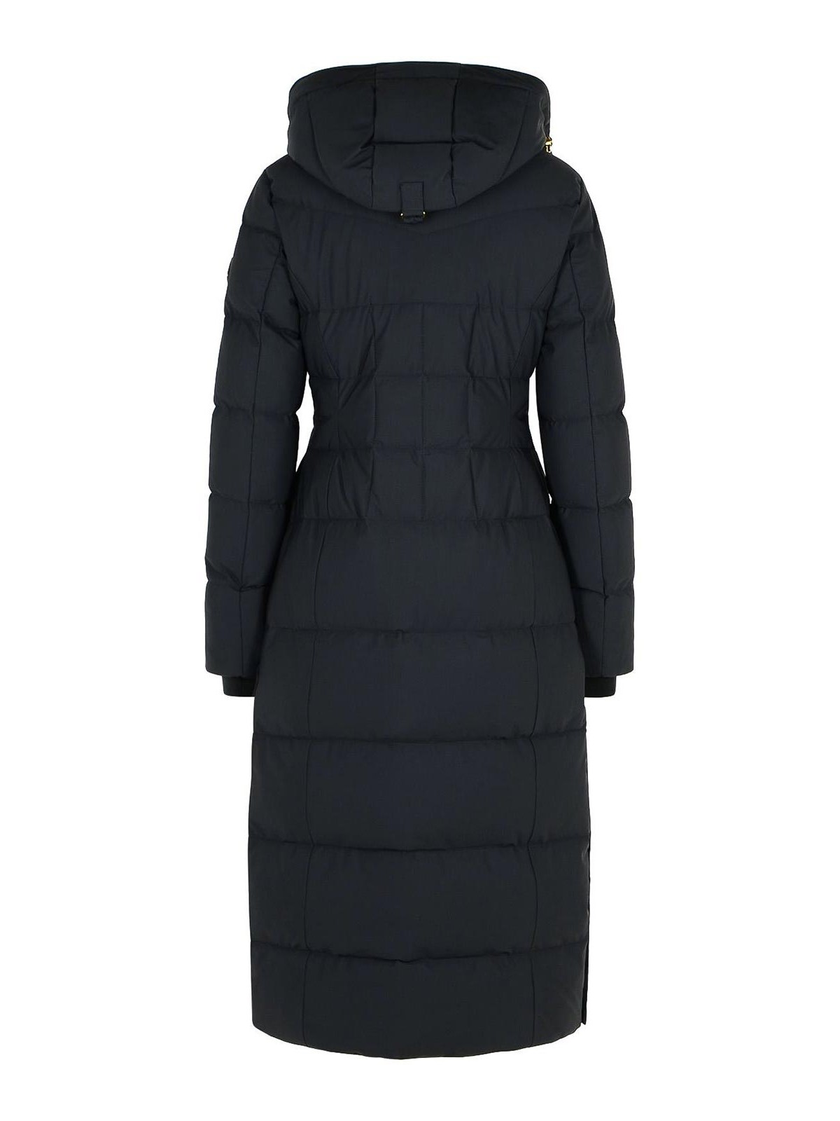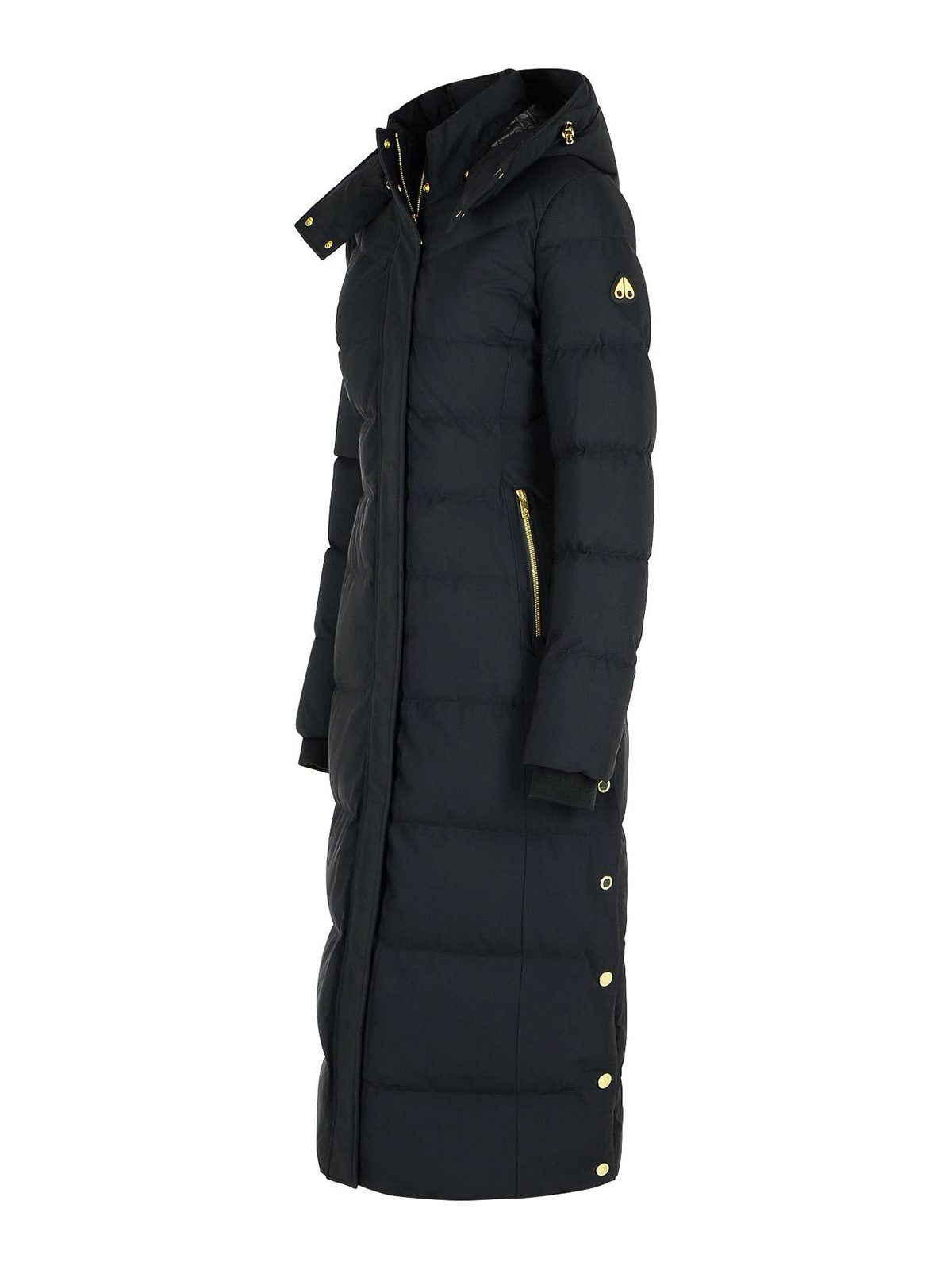 Capucha en mezcla de ganso con cremallera sintética aplicable y botón a presión, bolsillos laterales con cremallera, bolsillos interiores con cremallera, puños elásticos en el logotipo, parche en el dobladillo con botones laterales