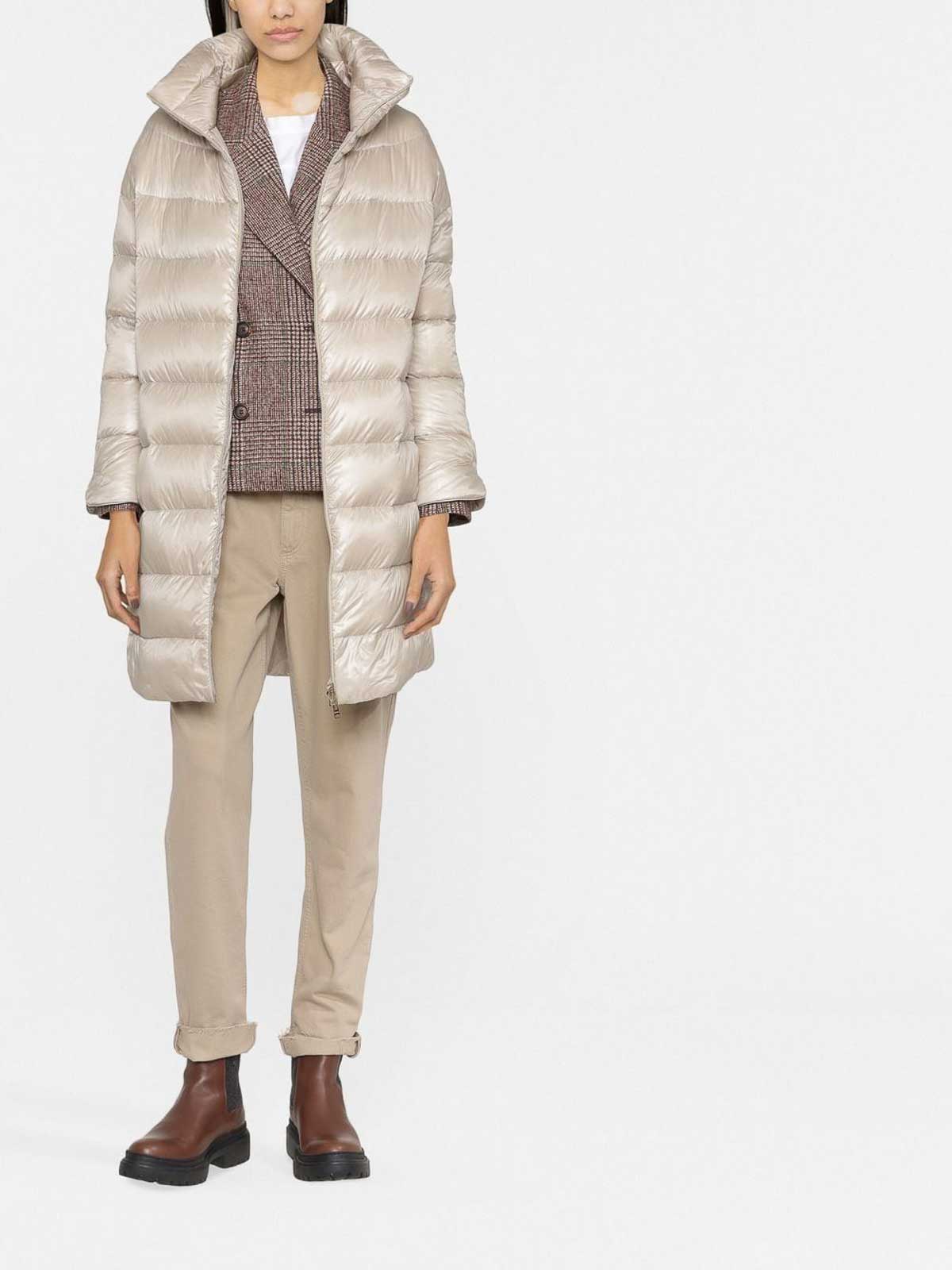 Diseño acolchado con relleno de plumas de ganso de color beige Chantilly, cuello alto en la parte delantera, cierre con cremallera bidireccional, mangas largas, dobladillo recto, bolsillo frontal con cierre de tachuelas