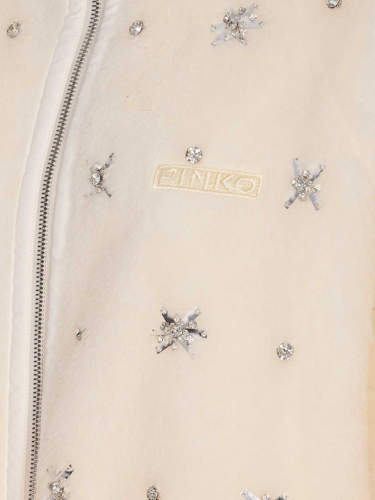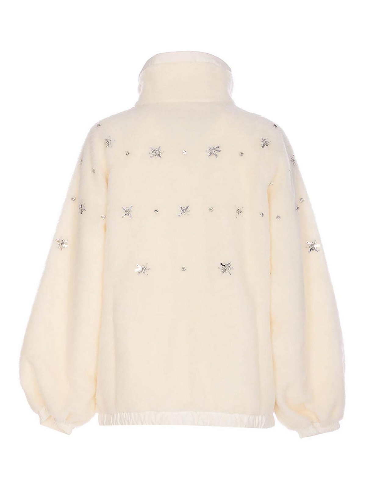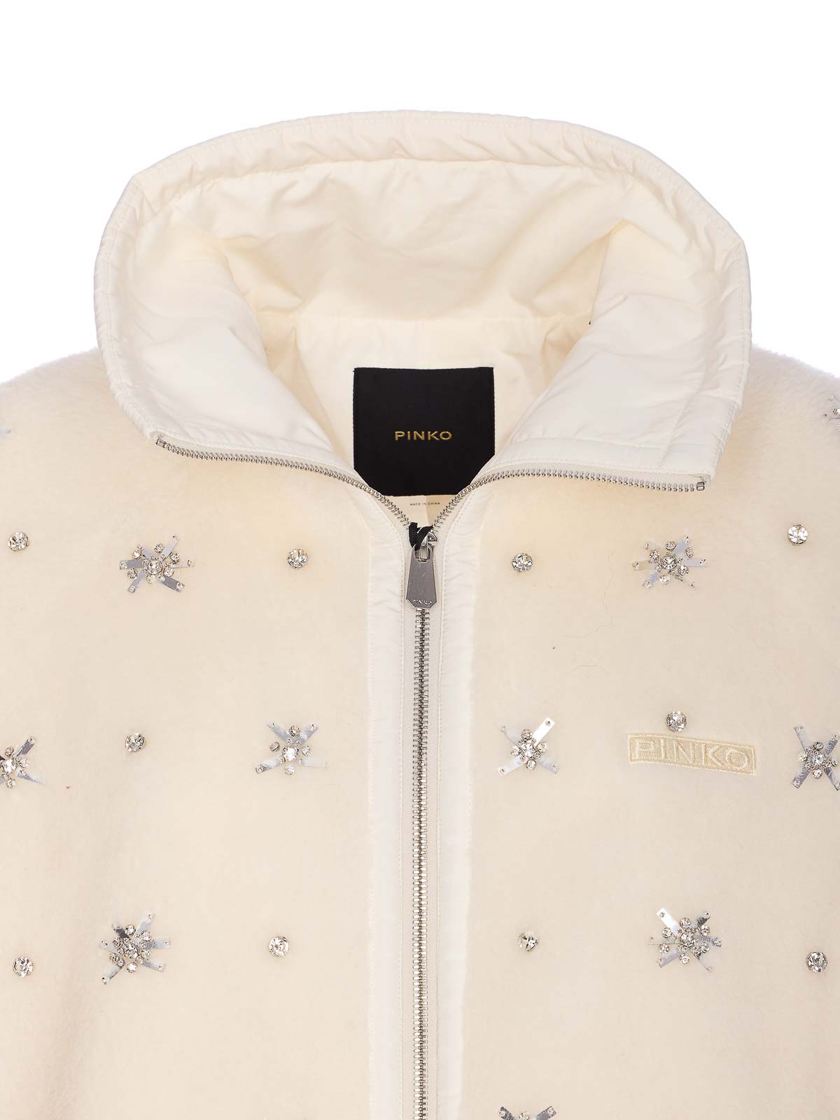 Bomber graciana de color rosa blanco con cierre frontal con cremallera, cuello alto, detalles de cristales en toda la superficie, bolsillos con cremallera