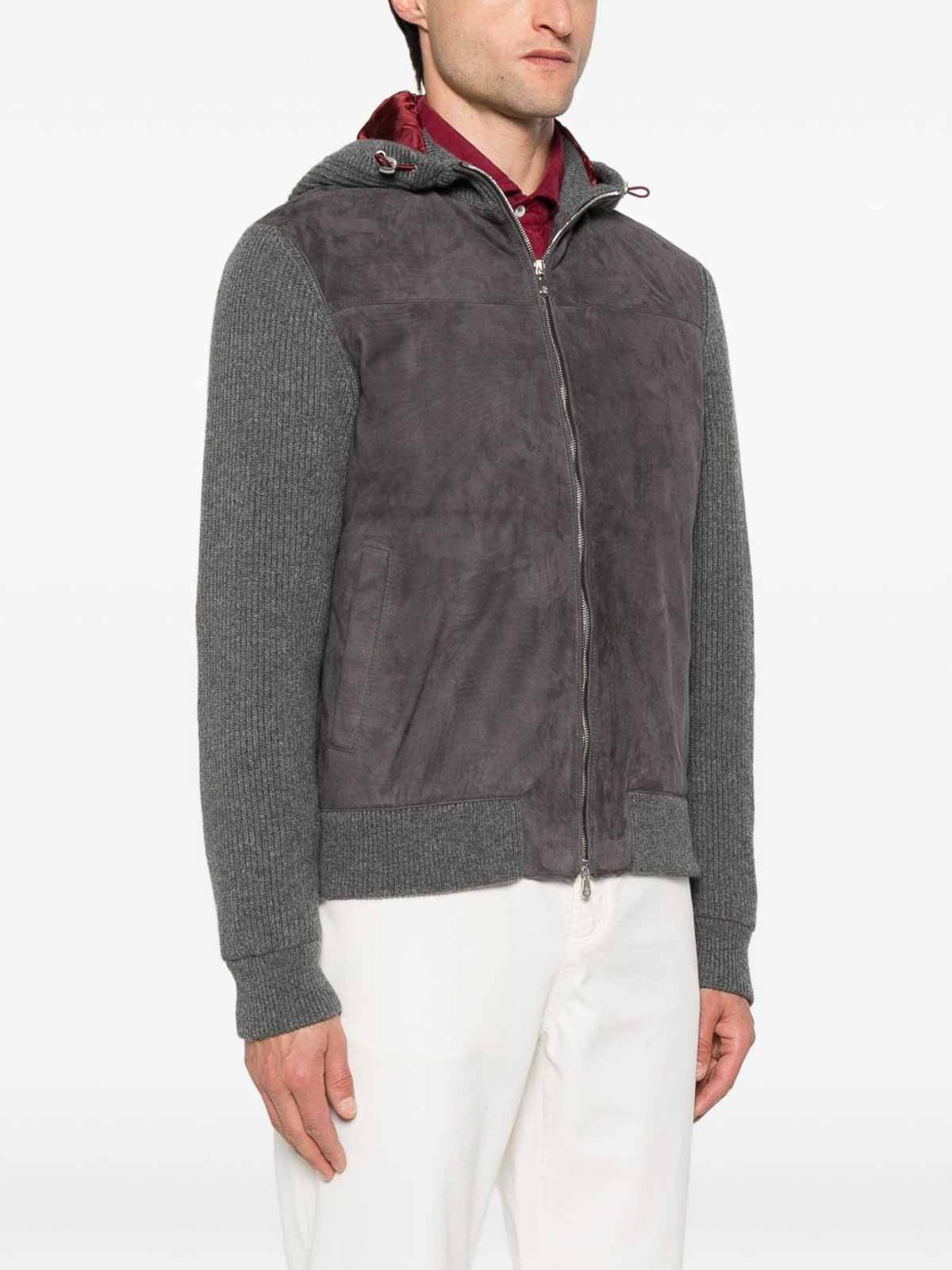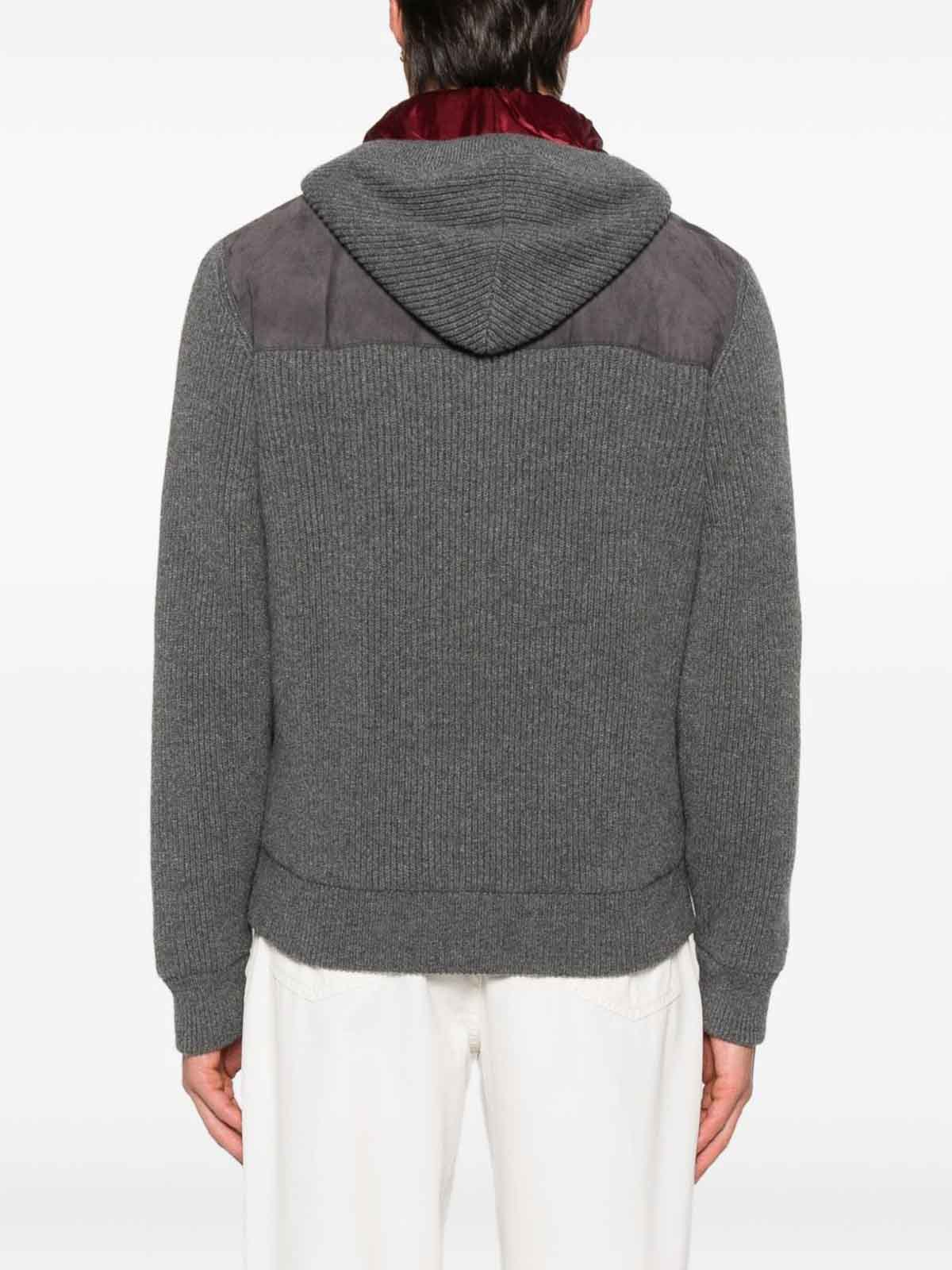 Parte delantera gris con cremallera, capucha, bolsillos laterales, filete