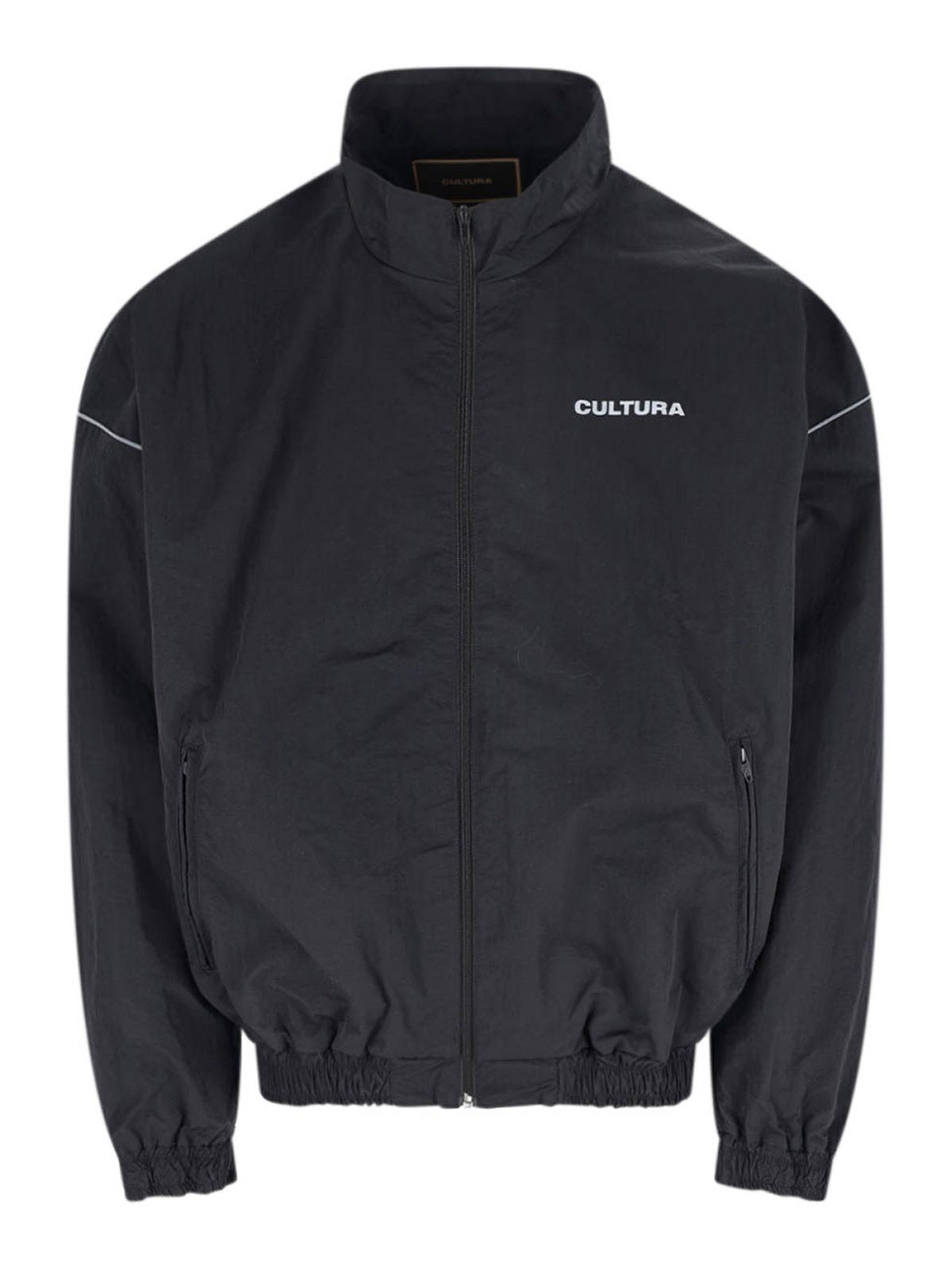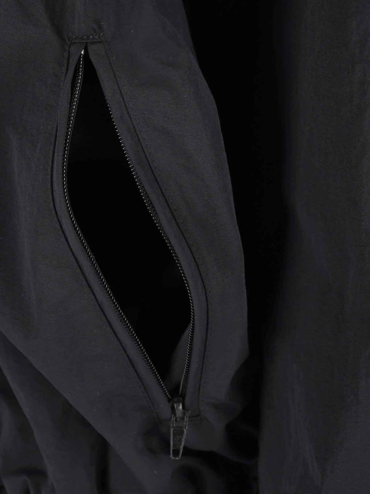 Chaqueta bomber con cremallera, confeccionada en nailon negro, cuello alto, hombros caídos, cierre con cremallera, estampado del logotipo en contraste, dos bolsillos laterales con cremallera, estampado trasero largo, acabados elásticos y dobladillo recto.