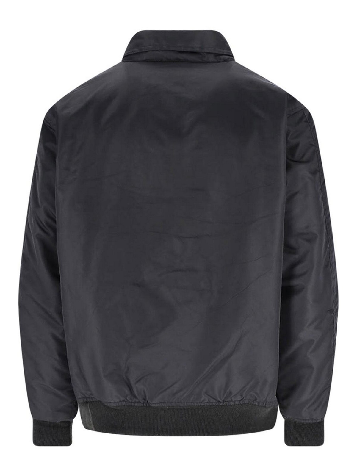 Chaqueta bomber con cremallera, confeccionada en nailon negro, cuello clásico, cierre con cremallera, dos bolsillos laterales, parche con el logotipo en contraste en la parte delantera, un bolsillo con cremallera en la manga, detalle de etiqueta con el logotipo, estampado del logotipo tono sobre tono en la parte posterior, acabados acanalados elásticos y dobladillo recto.