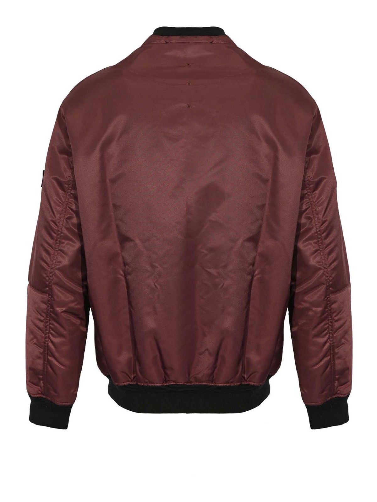 chaqueta bomber de nailon tejido premiata: 100% nailon con acolchado sintético ligero Patrón: burdeos lisos mangas: largas con puños de punto elástico Cuello: cuello redondo de punto negro Cierre: bolsillos frontales con cremallera bidireccional: dos bolsillos laterales inclinados con detalles de botones a presión: ribete acanalado en el cuello, los puños y el dobladillo, bolsillo con solapa en la manga izquierda, interior forrado, costuras tono sobre tono forrado: sí ajuste: regular