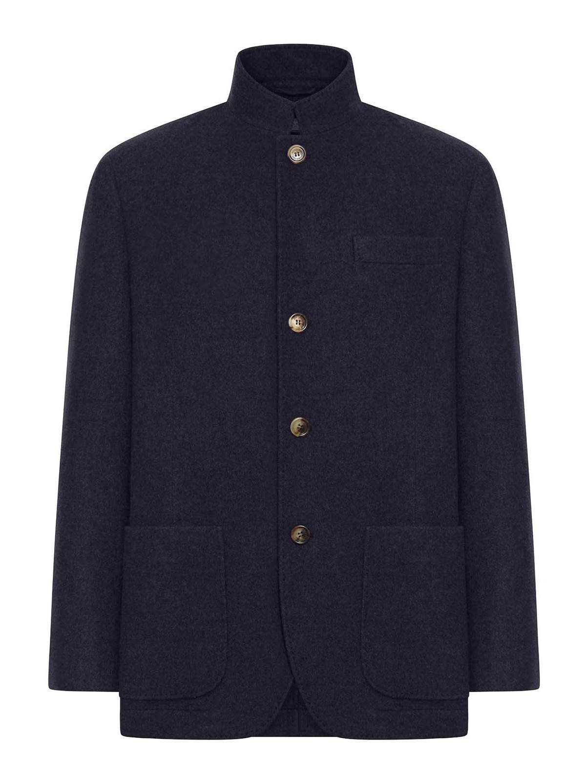 Cuello alto, abotonado, botones, bolsillo de bolsillo, bolsillos de parche en la parte superior, puños abotonados, dos aberturas en la espalda, color azul