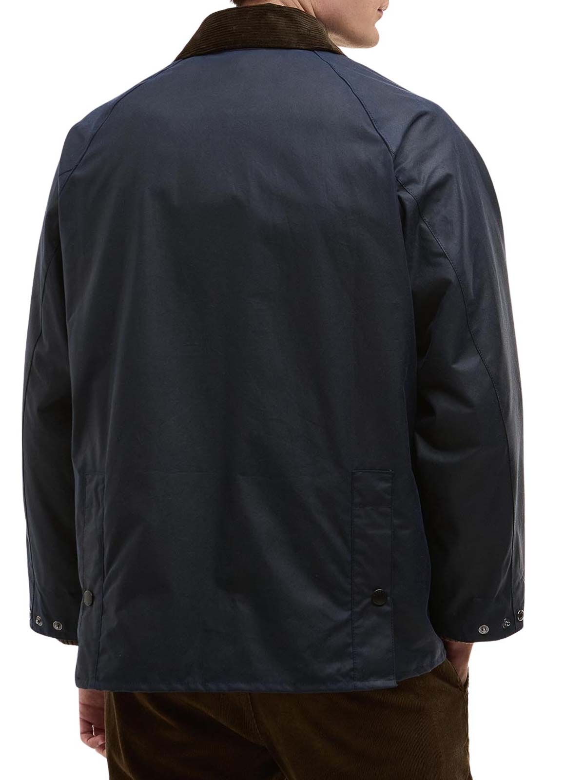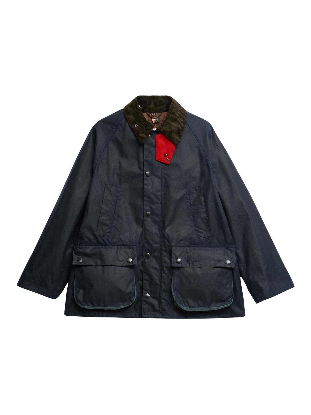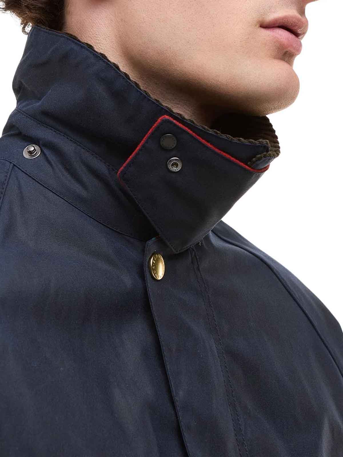 Barbour de algodón encerado azul oscuro, con detalles típicos de Paul Smith. Cuatro bolsillos con logotipo bordado. Forro estampado. Cierre frontal con cremallera y botón. Cuello acanalado marrón.