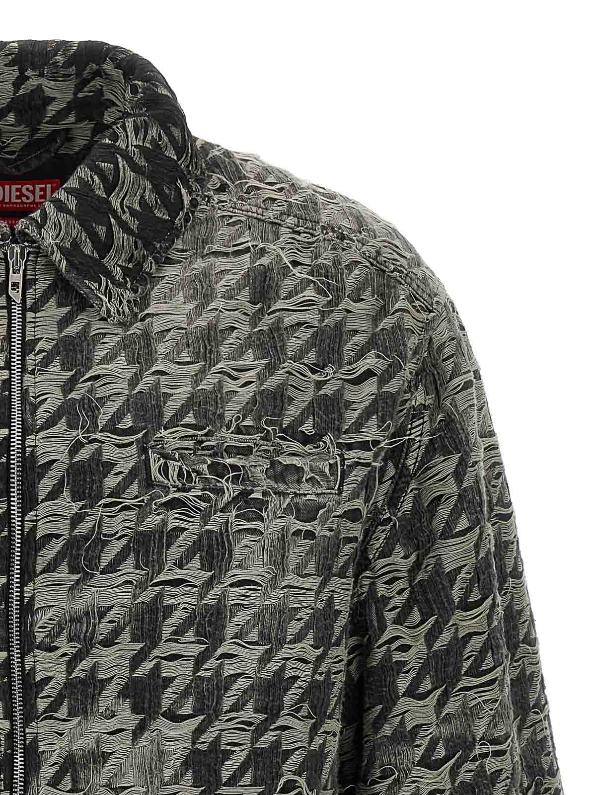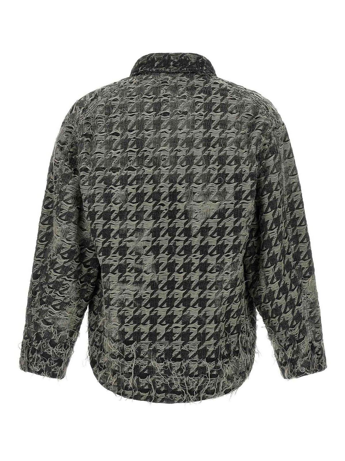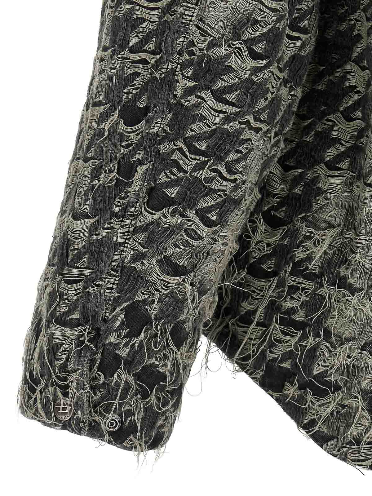 Chaqueta D, elmo, fsh en mezclilla cortada con láser para crear un estampado de pata de gallo con efecto quemado e hilos flotantes, cuello camisero, bolsillos con cremallera, mangas largas con puños y hombros caídos