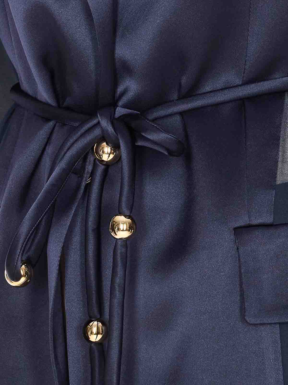Chaqueta tipo carillón azul rosa con cierre de botones, manga larga, cuello en V, cierre con botones, hombro reforzado, manga larga, detalle transparente, cinturón en la cintura