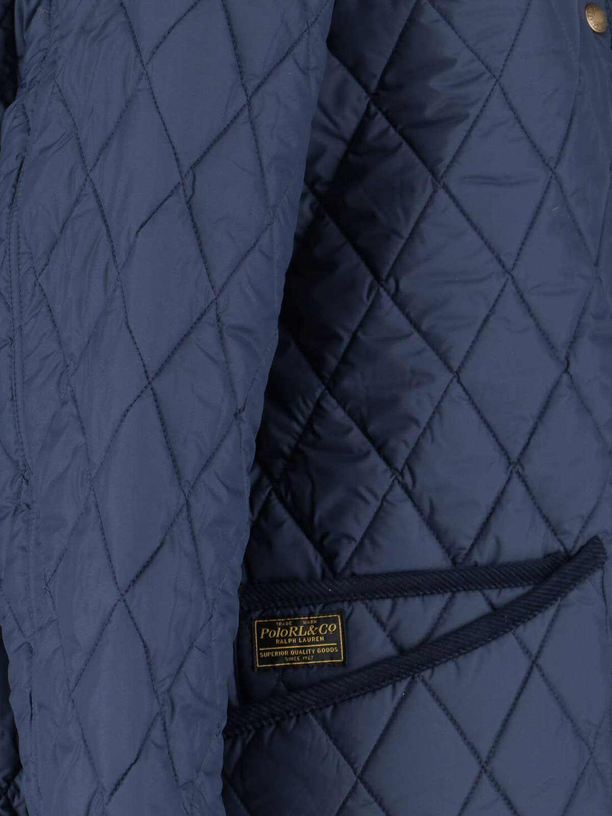 Chaqueta polo Ralph Lauren con el logotipo, en tela azul, motivo acolchado, cuello clásico de terciopelo, cierre con botones, logotipo bordado en la parte delantera, tres bolsillos planos enfrentados, un bolsillo interno plano, borde recto.