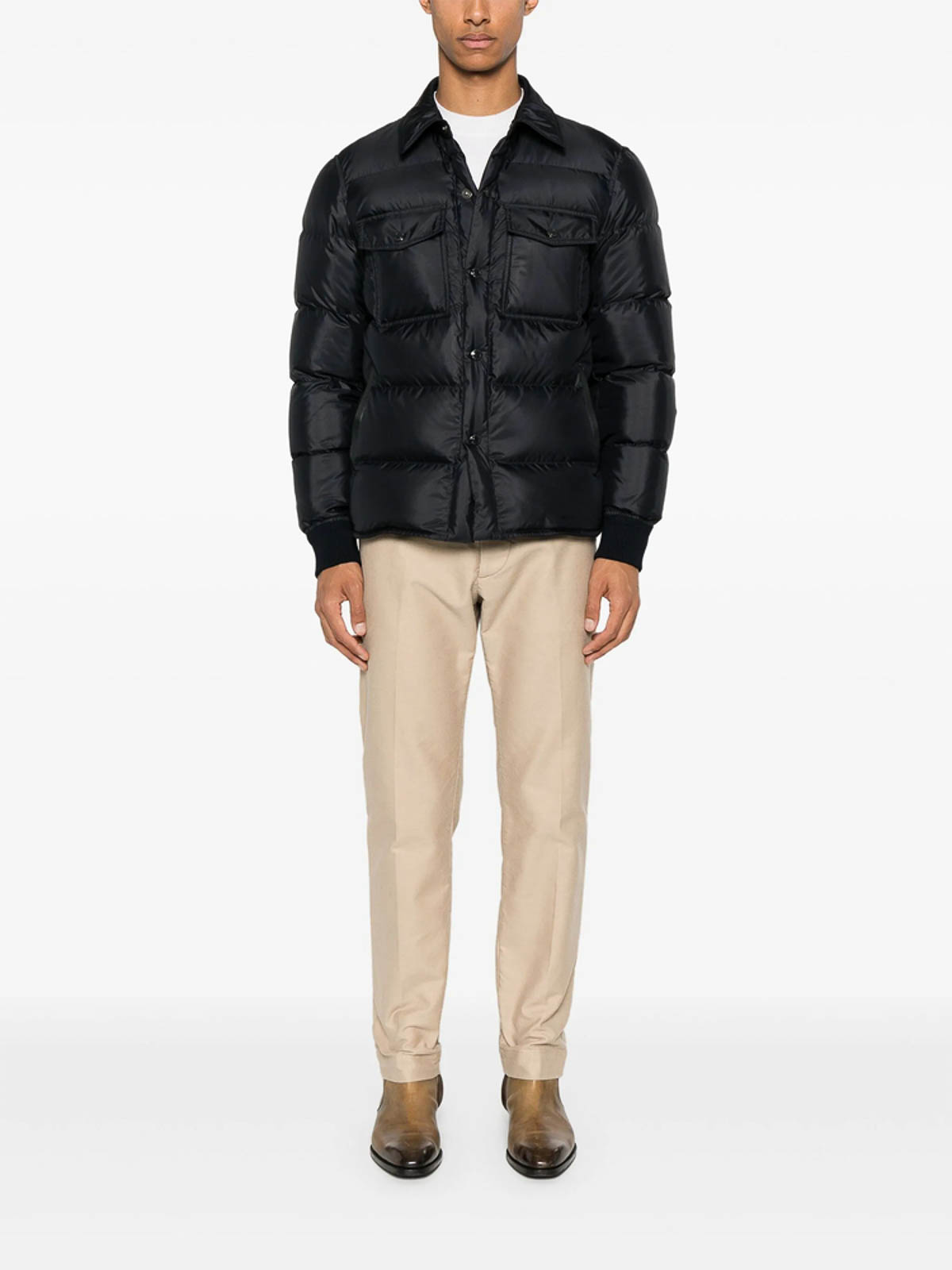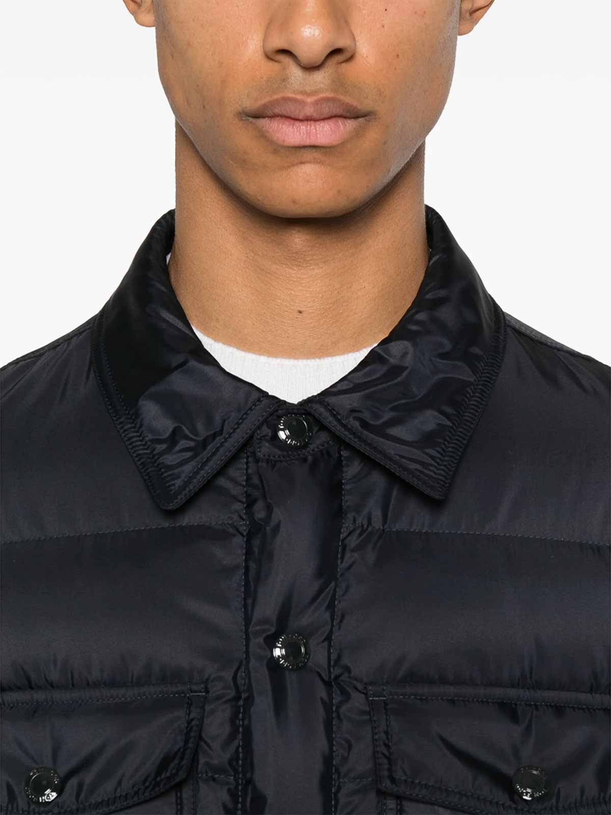 Dos bolsillos con solapa en el pecho con botones a presión en color azul medianoche, dos bolsillos ribeteados laterales, cuello clásico