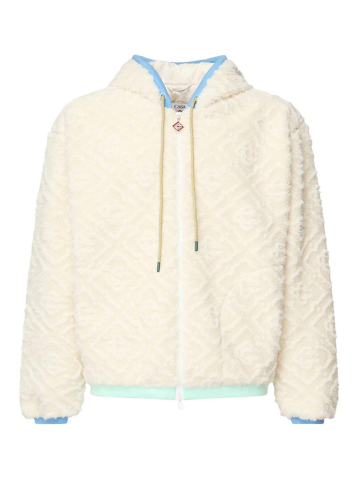 Capucha con cierre y cordón en contraste, puños y dobladillo, corte holgado, la talla que se muestra en la foto es de color L, blanquecino
